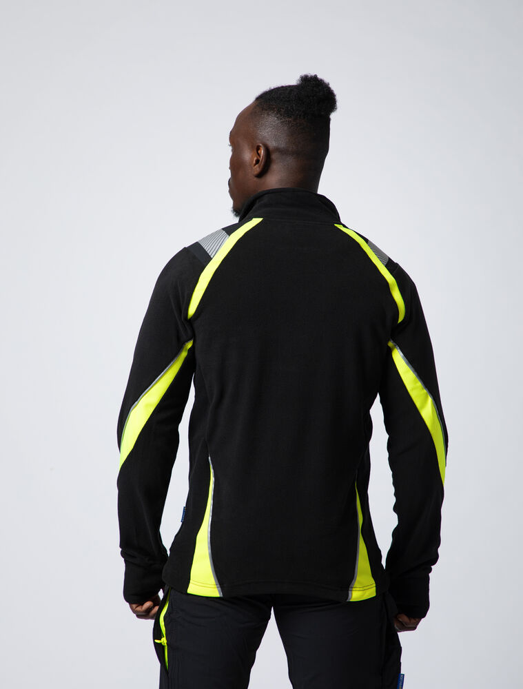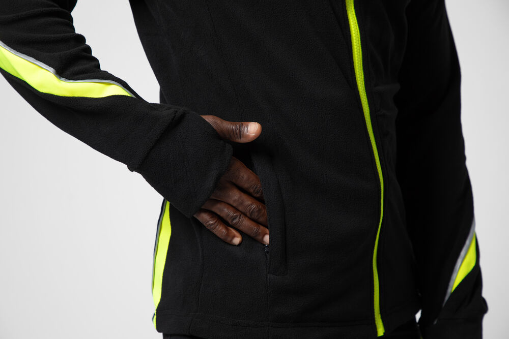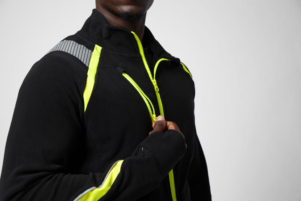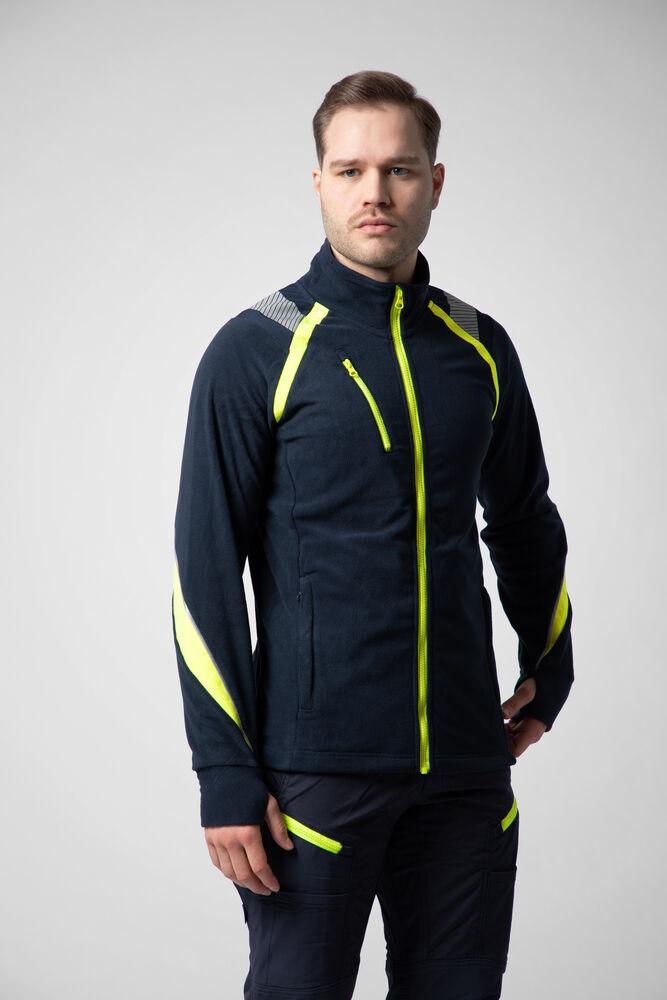 Mikrofleecejakke med raglanermer som gir god bevegelsesfrihet. Hel glidelås i front – med hakebeskyttelse for å forhindre gnaging på haken. Brystlomme med glidelås og innvendig feste for ID-kort. Sidelommer med skjult glidelås.