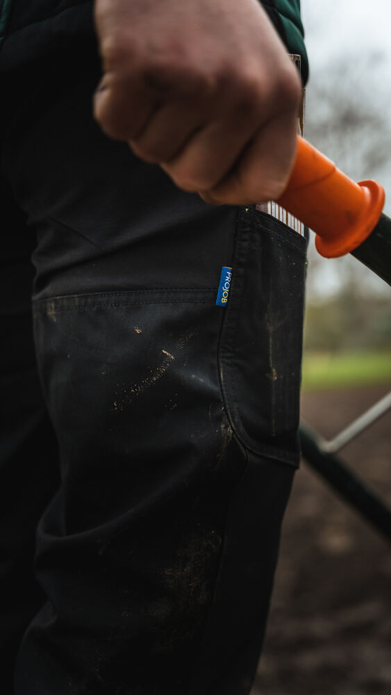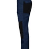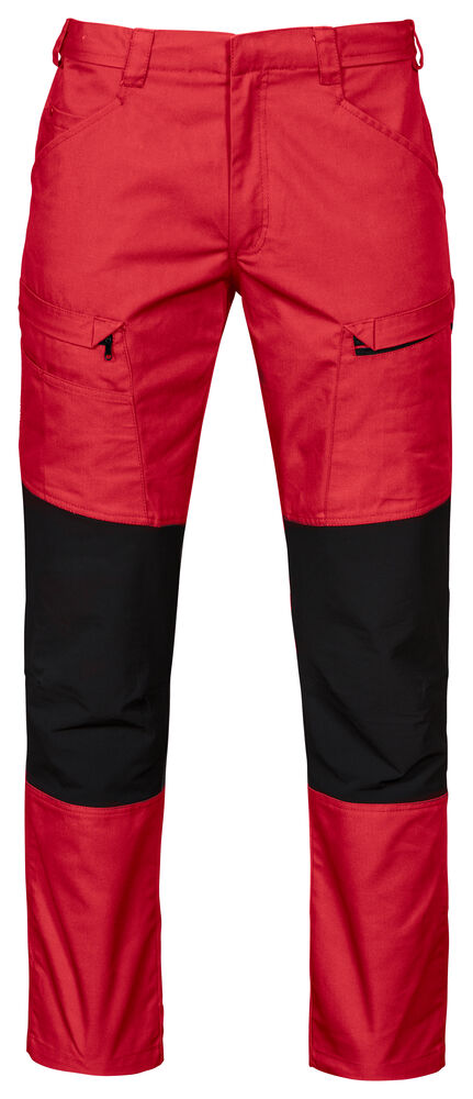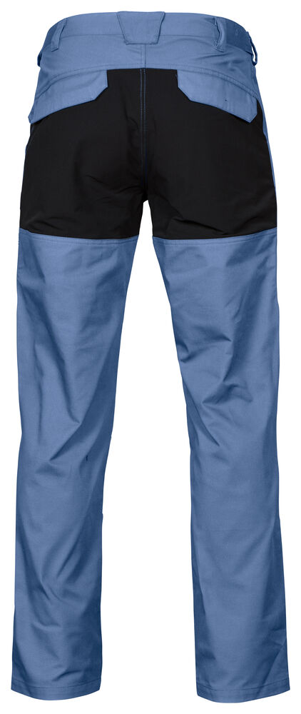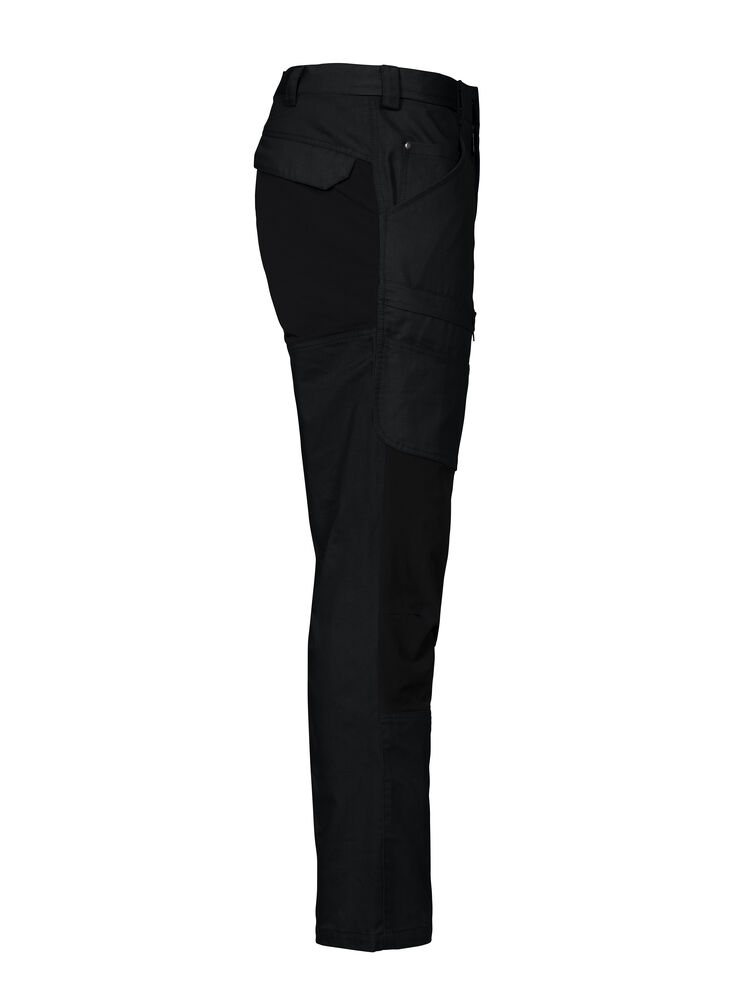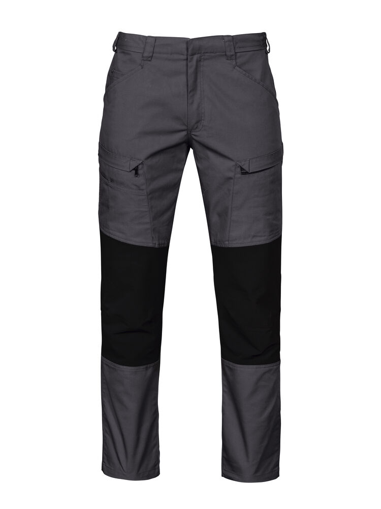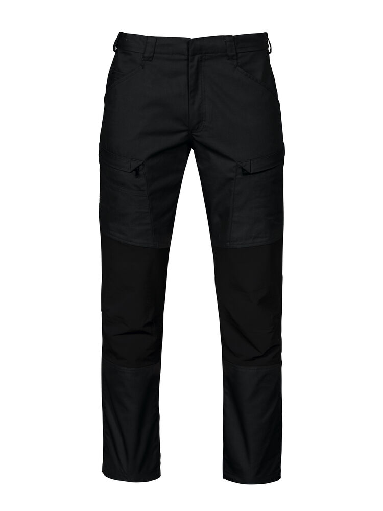 Servicebukse med stor fleksibilitet. Stretchstoff over sete, skritt og knær gir ekstra bevegelsesfrihet. Benlommer med glidelås, den venstre med innvendig telefonlomme og den høyre med innvendig hempe for ID-kort. Bredere belteløkke bak for å hindre press fra beltet. Baklommer med klaff og borrelås. Skjult feste for hylsterlommer (ref. artikkel 9042). Skjult knapp i front.