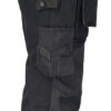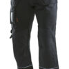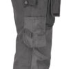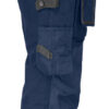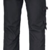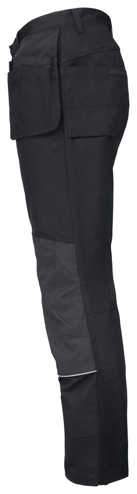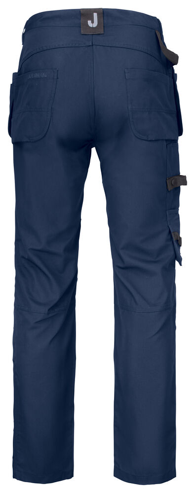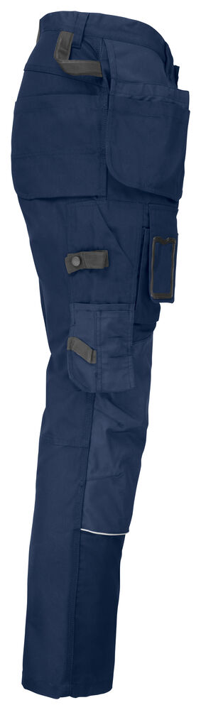 Kanvas i polyester/bomull som tåler vask på 85° og holder på fargen og formen. Romslige hengelommer som kan puttes i frontlommene. Gummiert knapp som reduserer faren for riper. Baklommer med forsterket innside. Hammerhank. Ekstra beltehemper på de største størrelsene. Benlomme med skjult glidelås som ikke ripes opp, mobiltelefonlomme, ID-kortholder og ekstra rom. Forbøyde knær for optimal passform. Knebeskyttelseslommer i slitesterkt polyamid med refleksbiser og to posisjoner for knebeskytterne.