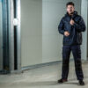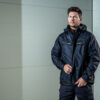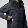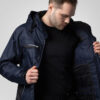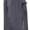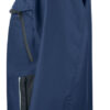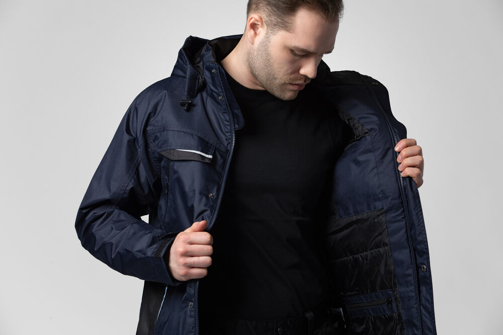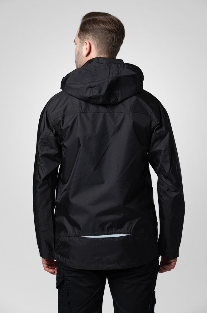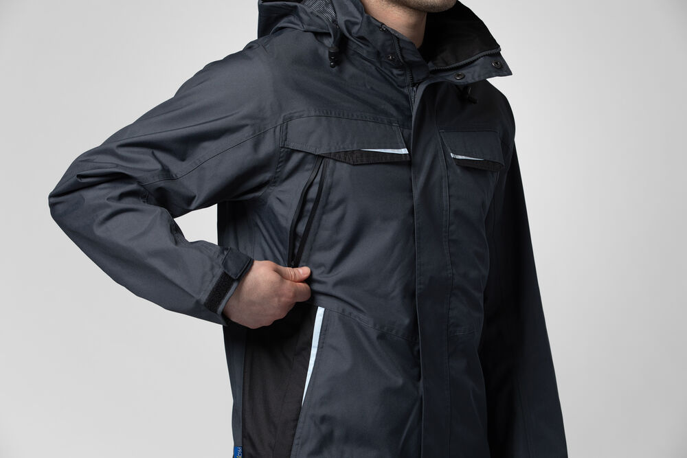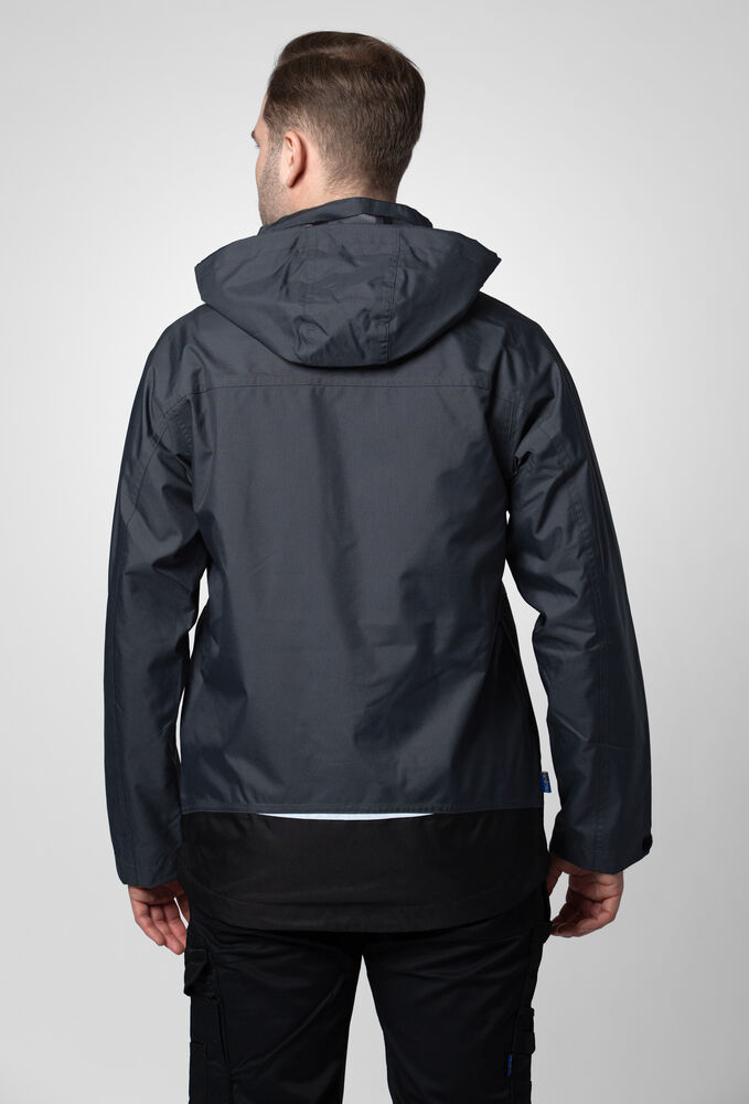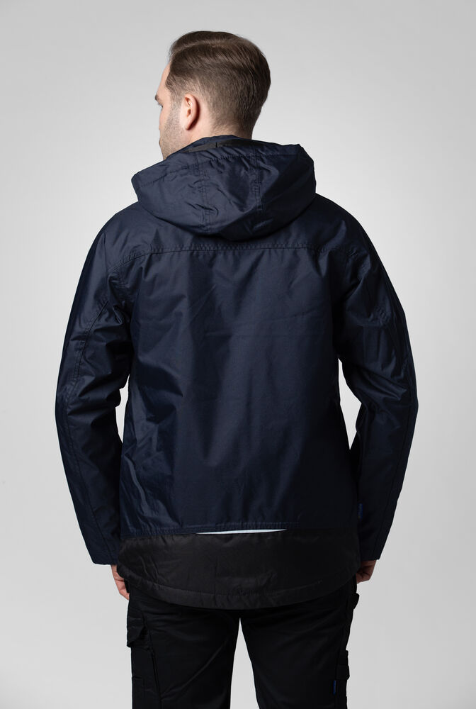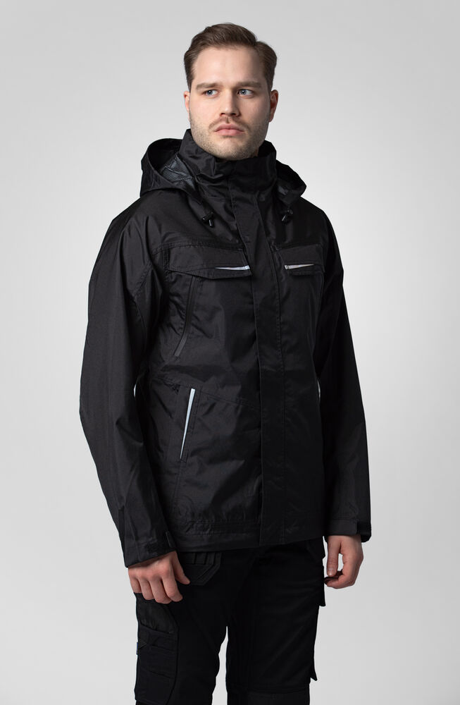 Polstret vind- og vanntett skalljakke med teipede sømmer. To-veis glidelås i front med klaff og trykknapper som beskytter mot regn og vind. Doble brystlommer, to med klaff og borrelås og to med vanntette glidelåser. ID-kortholder på ventre side. Sidelommer med glidelås og fleecefôr. Tre romslige innerlommer, to med glidelås. Avtagbar justerbar hette med snor. Justerbare mansjetter med borrelås, og justerbar midje med snøring. Fôr kan åpnes for enklere å trykke og brodering.