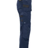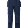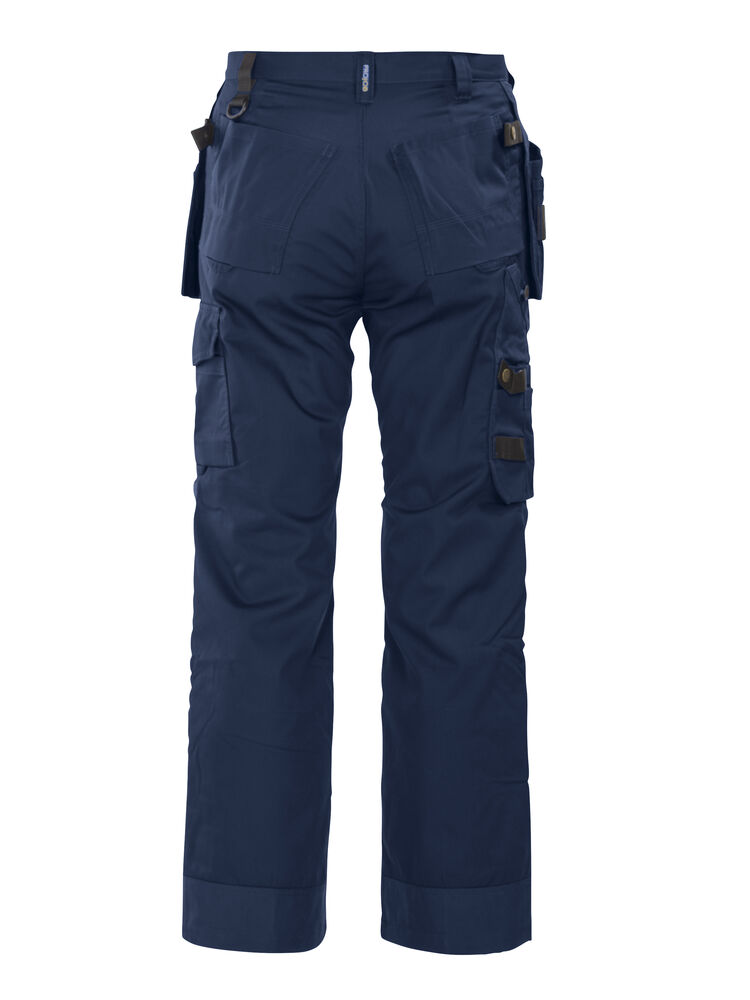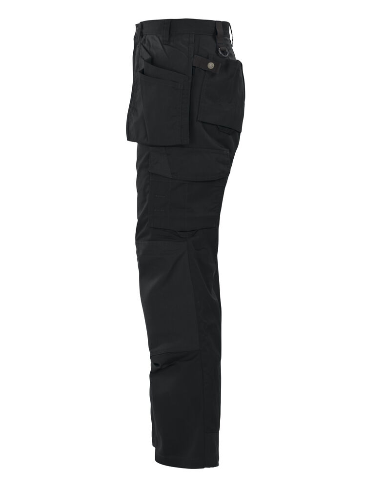 To hengende, spikerlommer som kan puttes bort; en med ekstra lommer og en med verktøyshemper. Spikerlommene er forsterkede med 100% Cordura®. Dype sidelommer med plass til hengelommene. Lårene er ekstra forsterkede med dobbelt stoff. Benlommer med plass til telefon, penn- og verktøy. To regulerbare hammerhanker. To D-ringer. Tommestokklomme med verktøyslomme og knivknapp. Knelommer i Cordura® med åpning fra innsiden og regulerbar høyde av knebeskyttelsene. Forbøyde knær. Forstekede nederst på baksiden av buksen med Cordura®. Romslige baklommer. Baklommer og benlommer har hemper for Inbags.