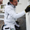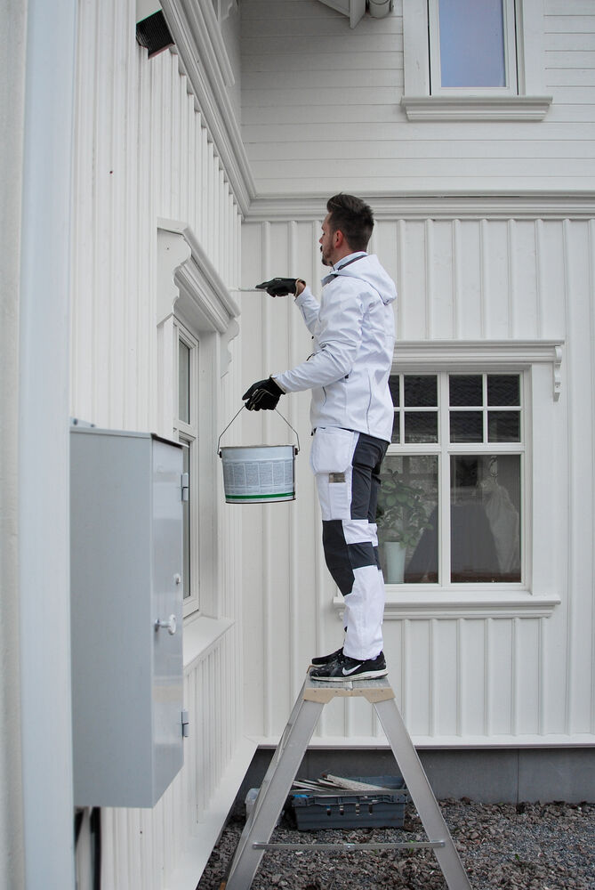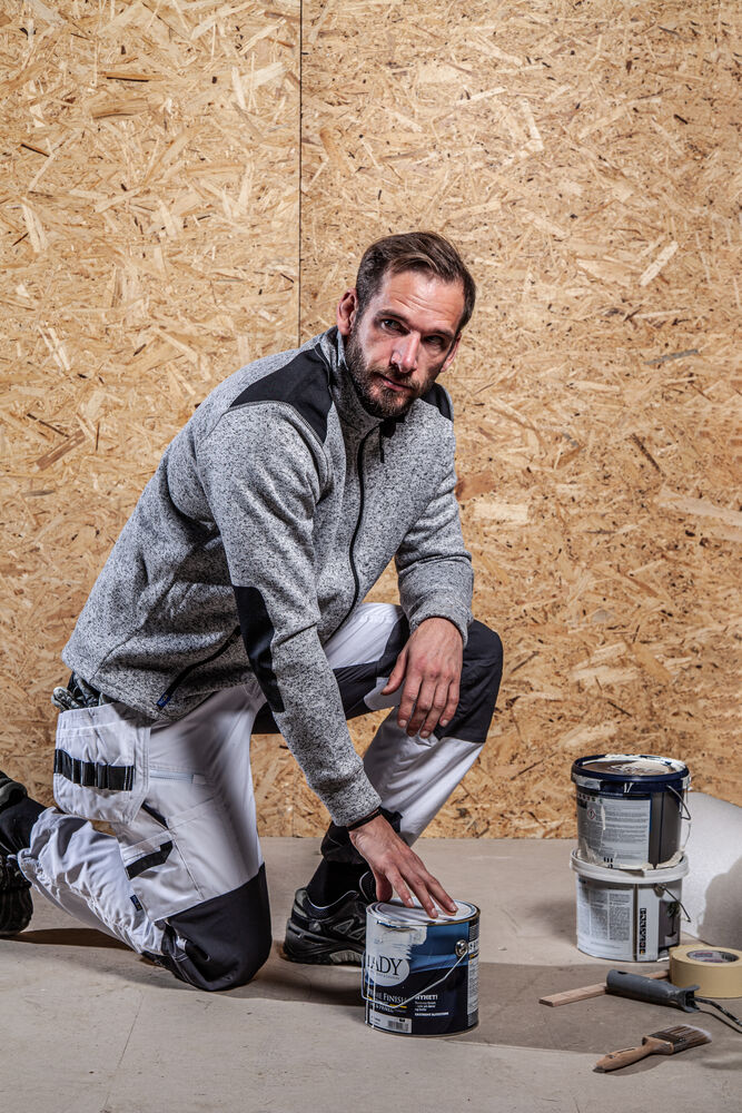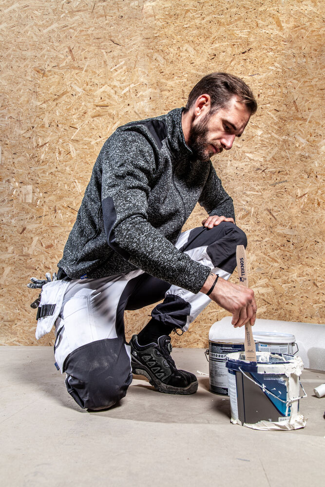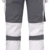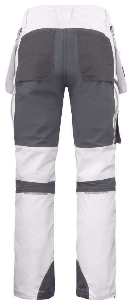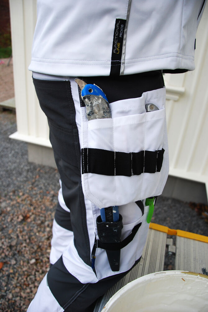 Malerbukse med stretch i skrittet og knehasen. Ekstra robust stretch på knærne. Lange ventilasjonskanaler på utsiden av beina. Forsterkede og sømløse benavslutninger for økt slitestyrke. Regulerbare benavslutninger. Forbøyde knær. Knelommer som åpnes innenfra med regulerbar knebeskyttelseshøyde.To lårlommer, den høyre med tommestokklomme, samt to baklommer. To avtagbare hengelommer.