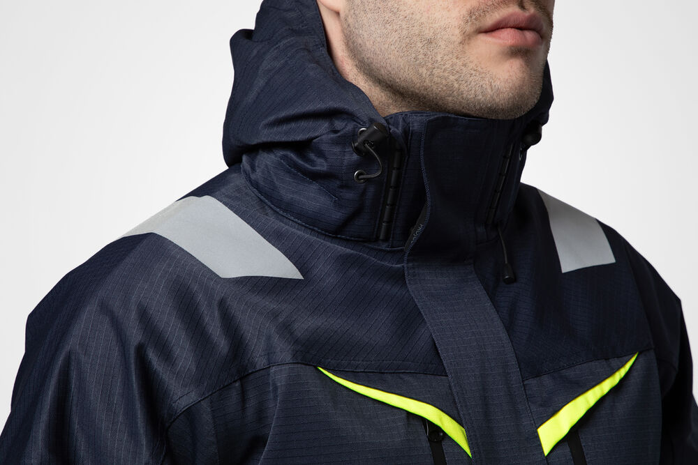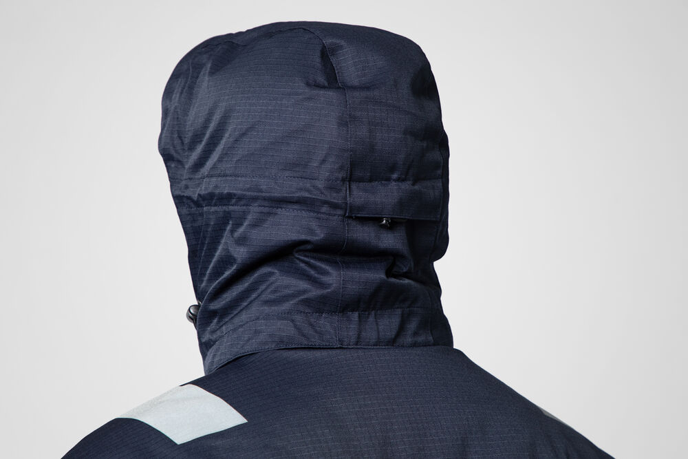 Vind- og vanntett vattert jakke med teipede sømmer i rip-stop materiale. Toveis glidelås foran med klaff for å hindre vindtrekk og vanninntrenging. Klaffen lukkes med trykknapper. Brystlommer på begge sider med glidelås. Venstre brystlomme med innvendig brakett for ID-kort. Sidelommer med glidelås. Innvendige lommer på begge sider med glidelås, på venstre side har den en åpen lomme med borrelås. Avtagbar hette. Hetten er justerbar med snøring. Justerbare mansjetter med borrelås. Mansjettene har tommelgrep. Justerbar snøring i kanten. Fôr kan åpnes for å forenkle trykk.