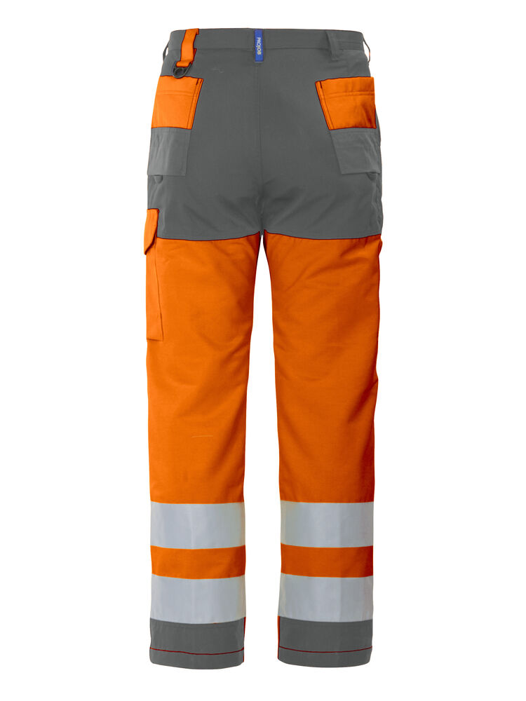 Arbeidsbukse med ”flat front”. Sidelommer i front, sikkerhetslomme med glidelås på høyre side. To benlommer med pennerom, venstre med plass for mobil. Tommestokkslomme. Polyamidforsterkninger i framkant av lommene, nedre del av baklommene, forsterket kant på tommestokklomme, penn- og polyamidforsterkning i nedre del av Benlomme og i nederkant bak av bukse. Knebeskyttelseslommer på innsiden. Hemper under baklommer og benlommer å feste Inbags i. Maks 50 vask i 60°C.