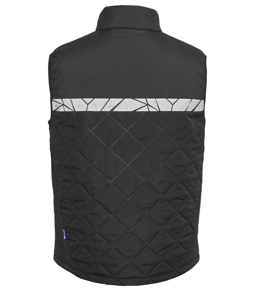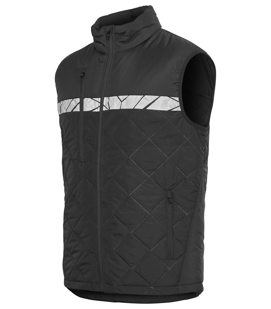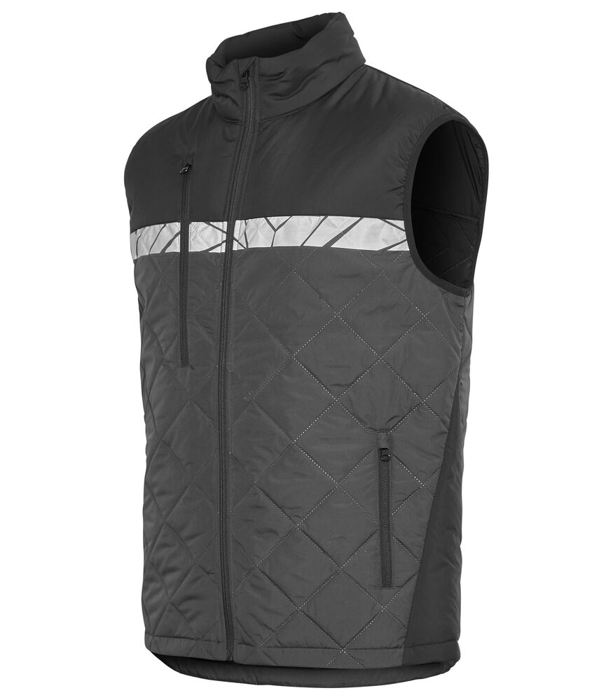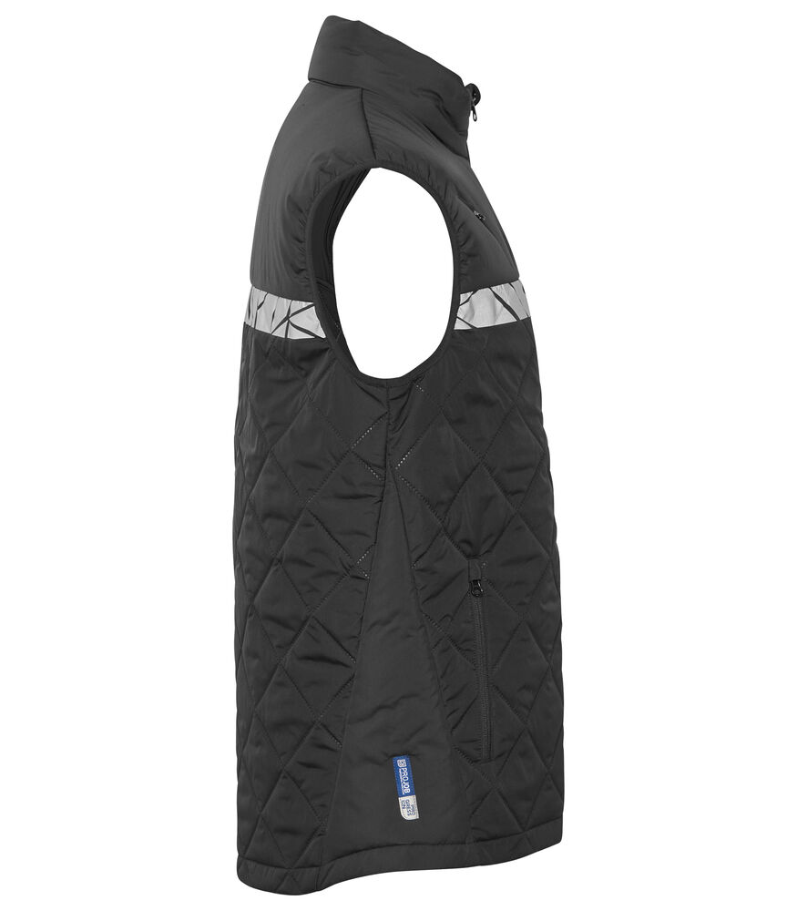 Vest i lett, sømløst, diamant-kviltet stoff. Brystlomme på høyre side med glidelås, samt innvendig feste for ID-kort. Sidelommer på begge sider med glidelåslukking. Lomme for vaskebrikker i venstre sidesøm.