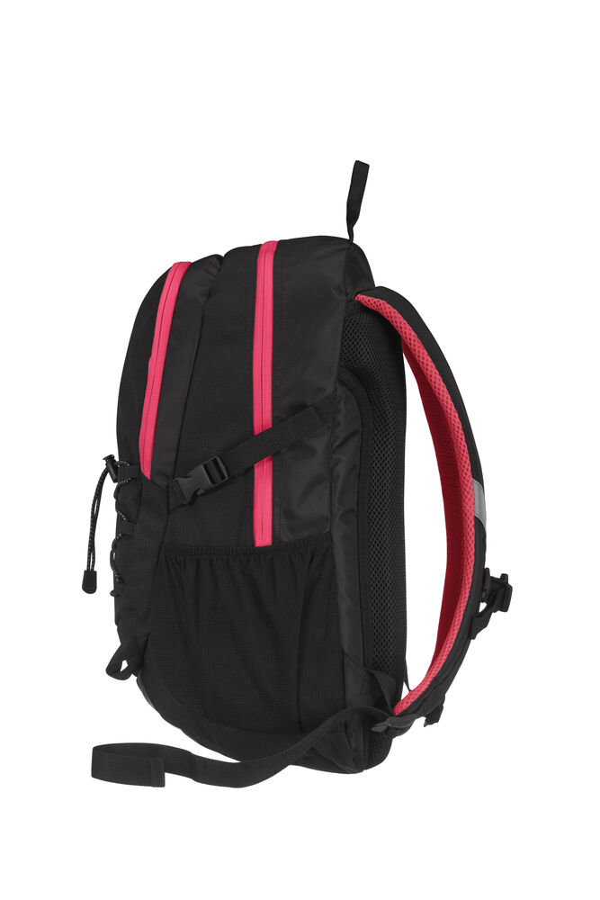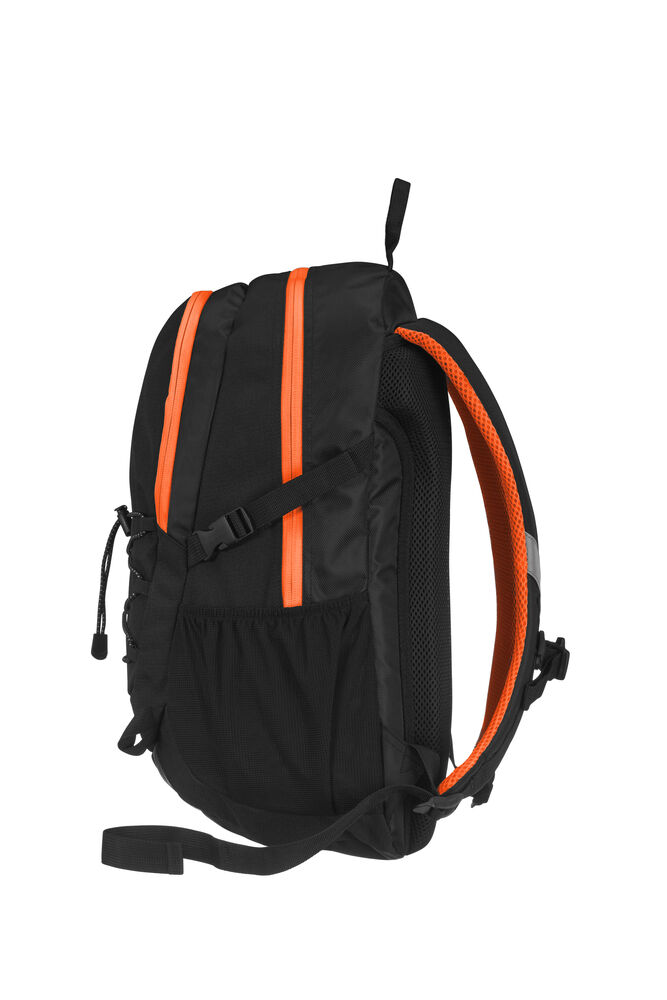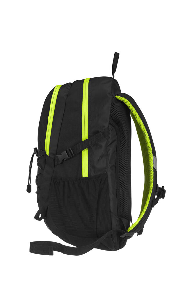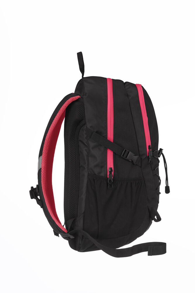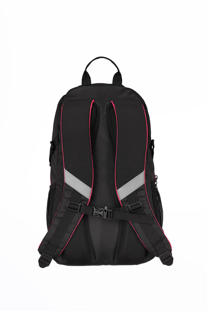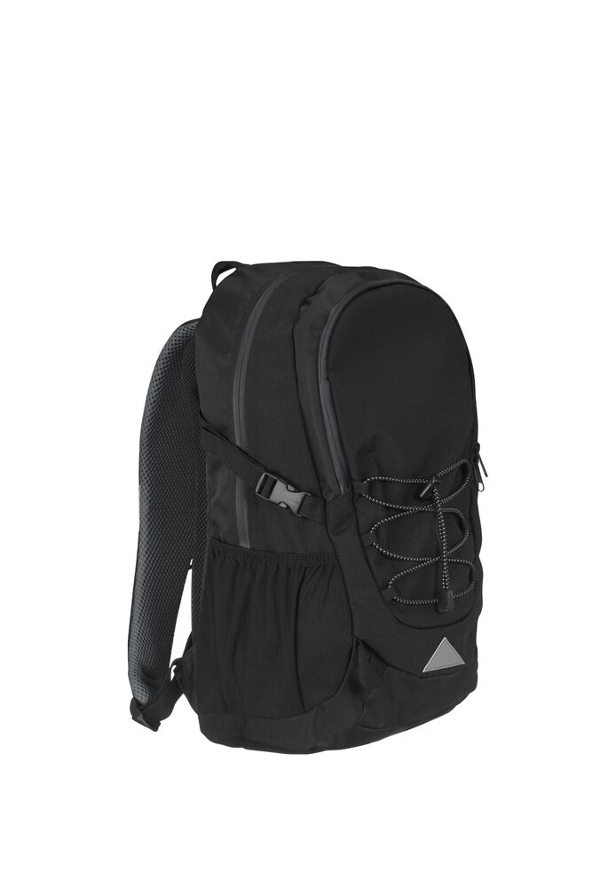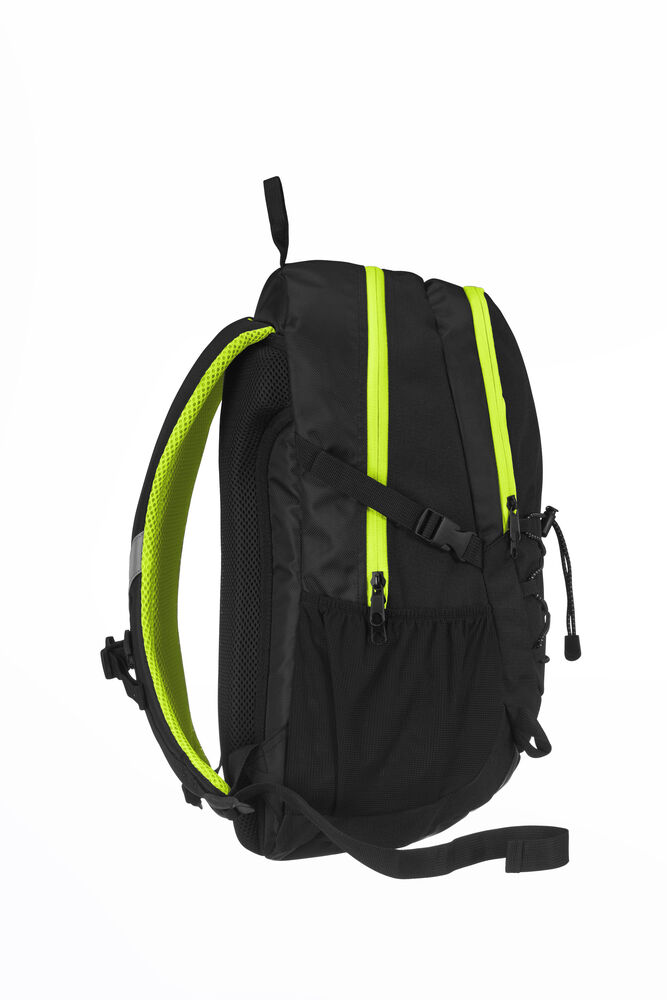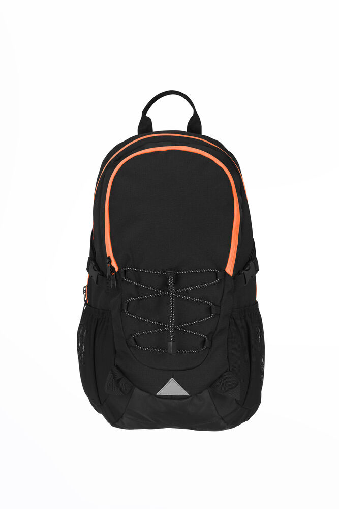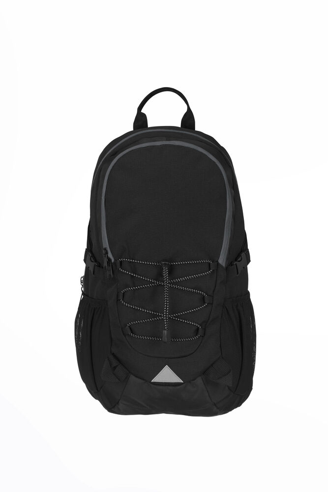Sekk som har hovedrom med stor innerlomme, og fronlomme med en mindre lomme samt nøkkelrom. Ventierende ryggparti og formede skuldrestropper med brystspenne. Sidelommer i mesh og elastiske stropper i front for ekstra oppbevaring. Refleksdetaljer i front og på skulderpartiene.