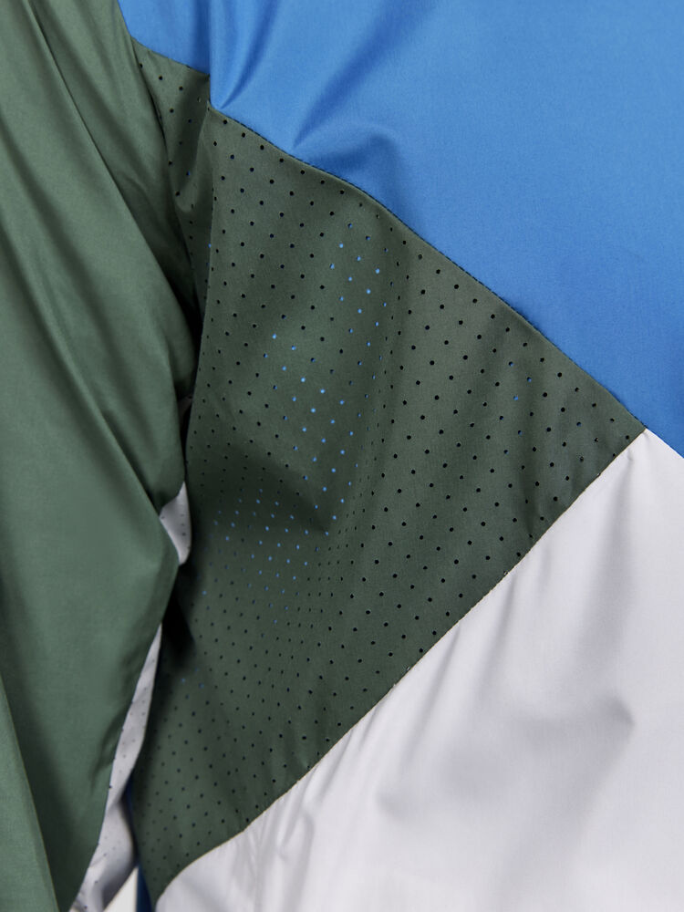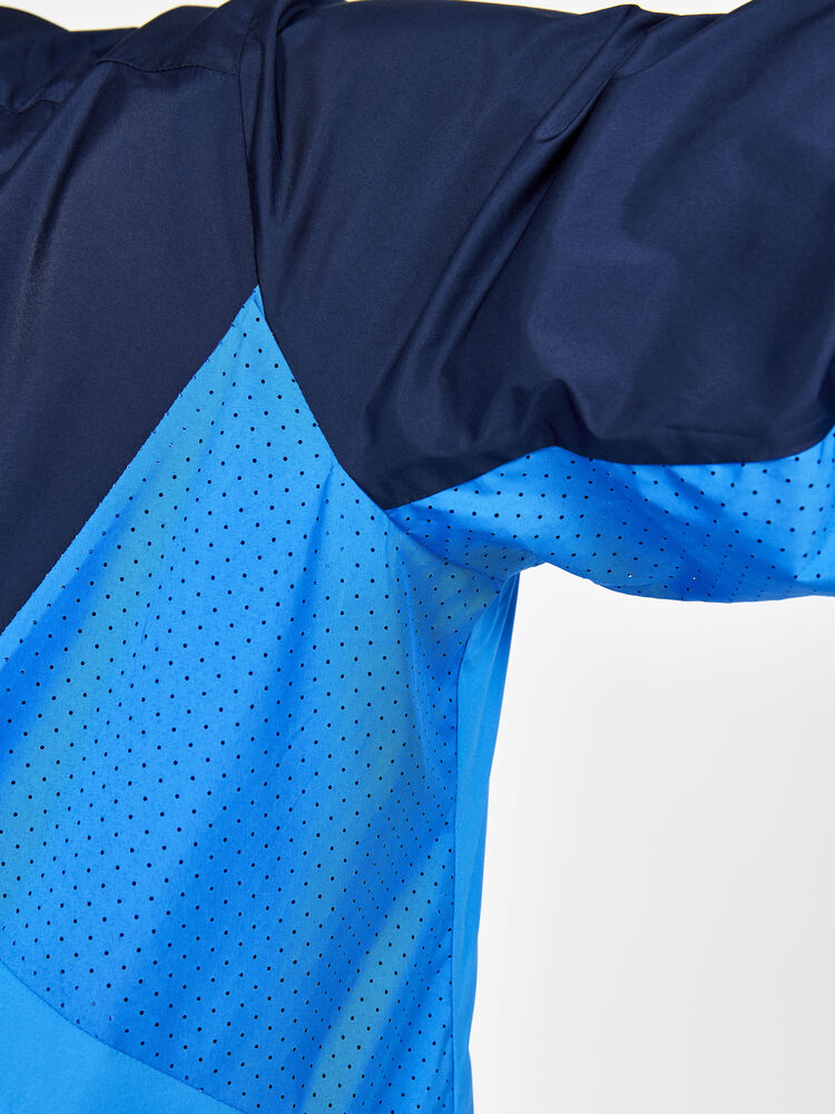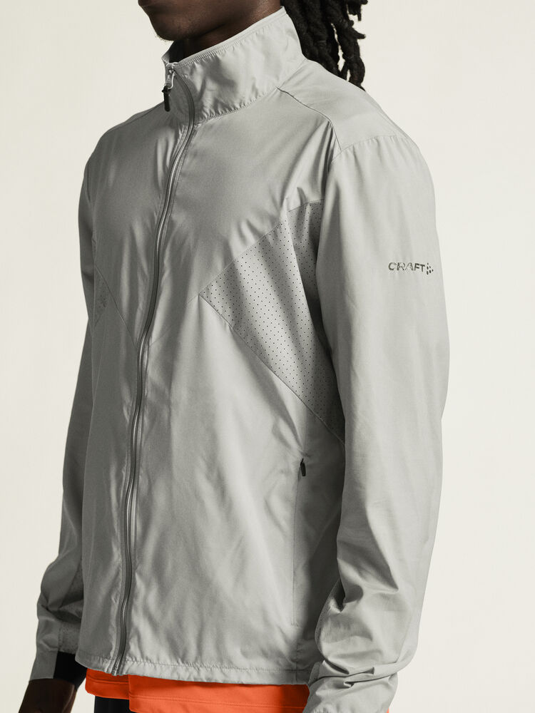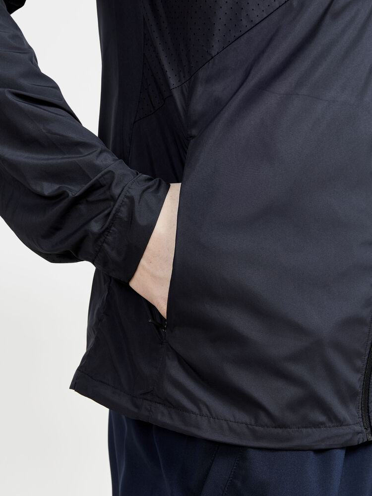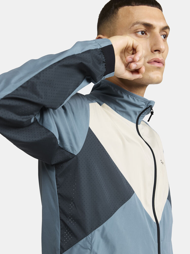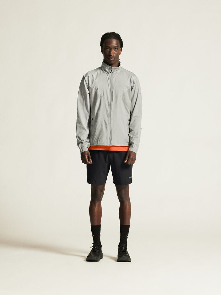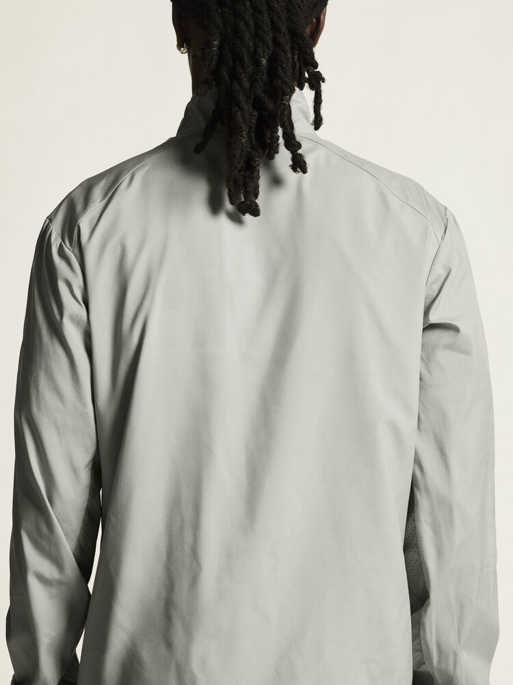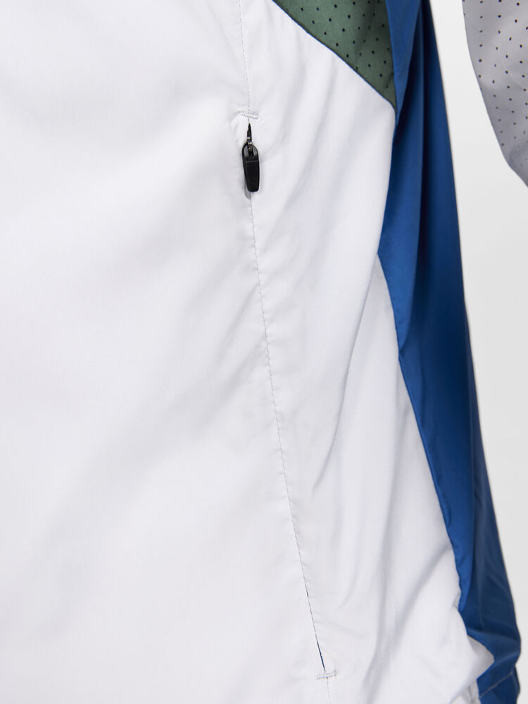 Vind- og vannavvisende herrejakke perfekt for intens trening, løping og lignende aktiviteter. Jakken er laget av vevd, myk og lett resirkulert polyester og har perforeringer på brystet og under ermene for bedre ventilasjon. Elastisk strikk i ermene.