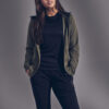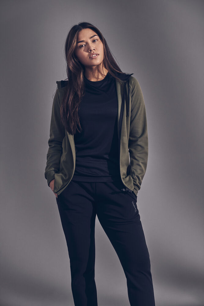 Myk joggebukse produsert av resirkulert polyester. To lommer med glidelås.