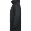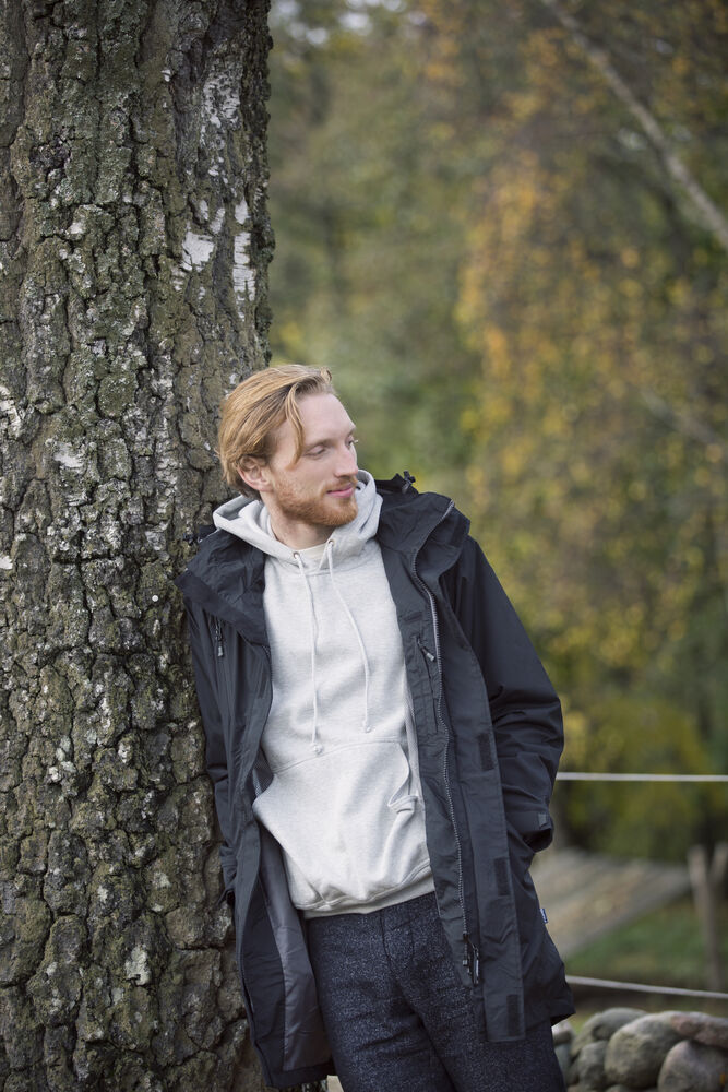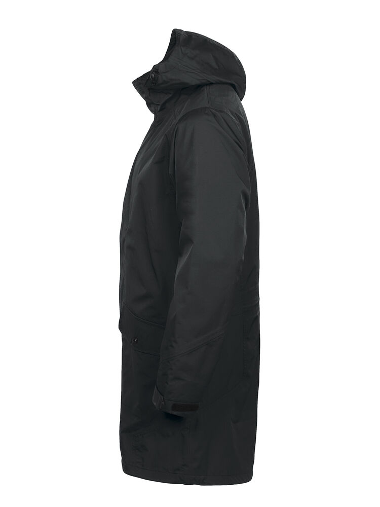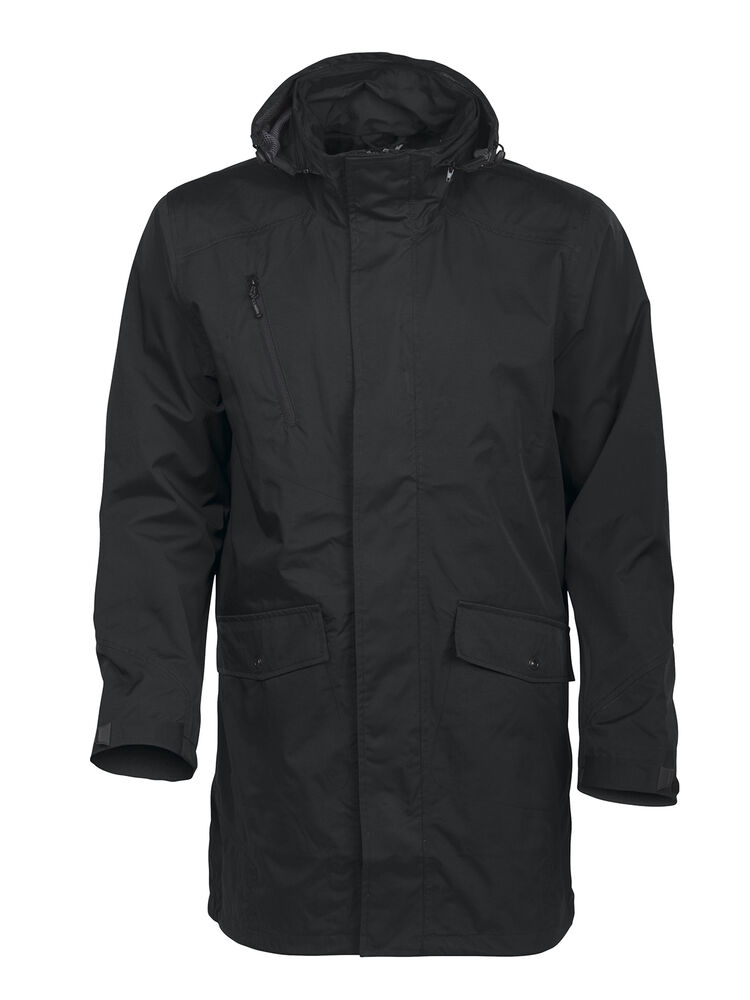 Lang og glatt allværsparkas som er vind-og vanntett og pustende med tapede sømmer (WP3000/MVP3000) og mesh fôr. Forlenget i ryggen, snor i rygg og nederkant. Forbøyde ermer med borrelåsjustering. Høy krage med avtagbar hette. To ytre lommer, en brystlomme og to innerlommer med hodetelefonutgang.