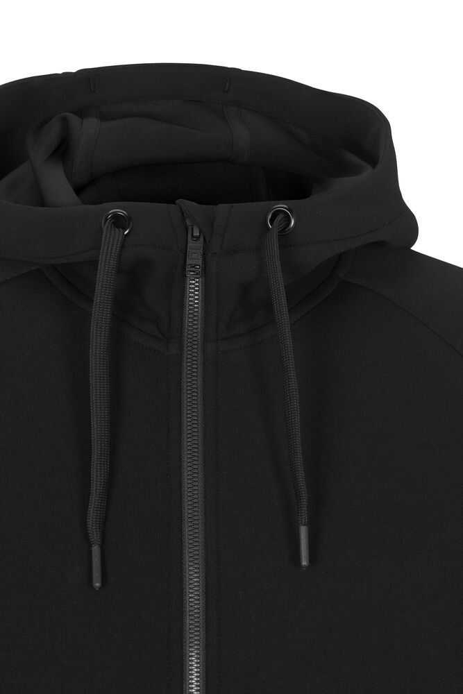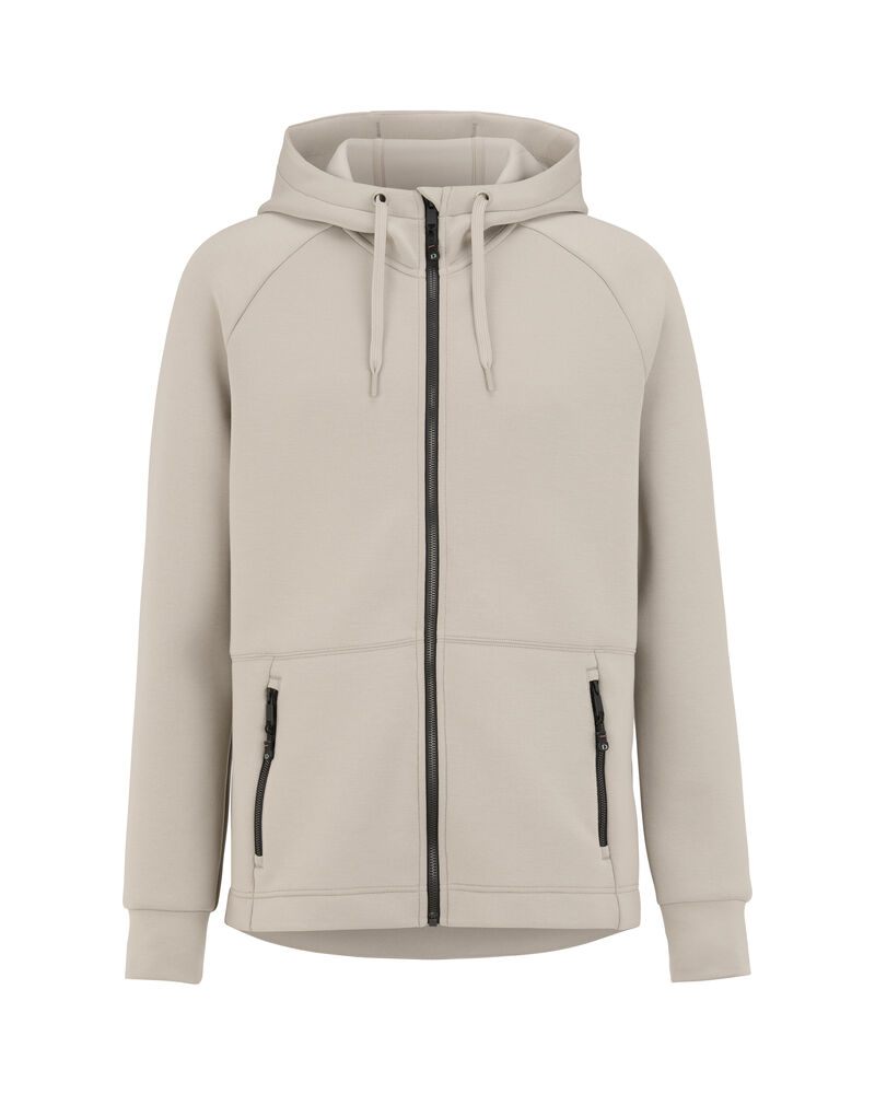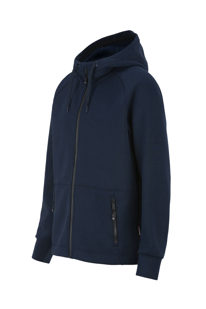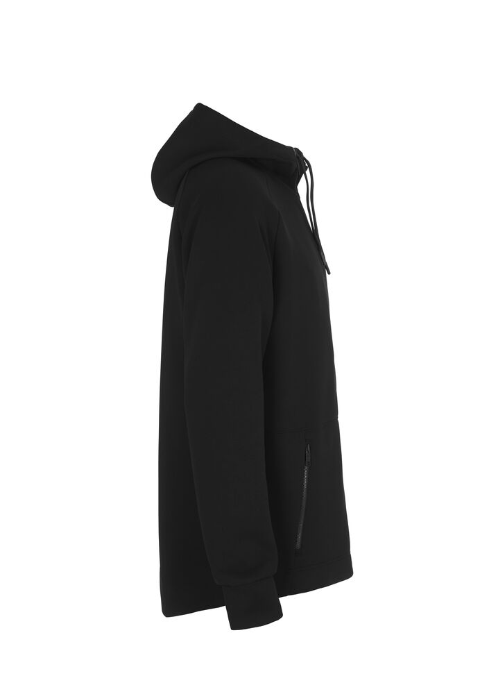 Hettegenser laget i et dobbeltstrikket materiale med ekstra stretch. Hettegenseren er laget av et blandemateriale med bl. annet sertifisert resirkulert polyester. Sydde mansjetter i nederkant og ermeavslutninger. Formsydd hette med doble sømmer og snøring. Glidelås som går opp i kragen og frontlommer med dekorative, sorte glidelåser. Hettegenseren har raglanermer og litt lengre rygg, noe som gir en svært god passform.
