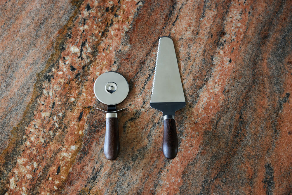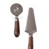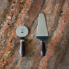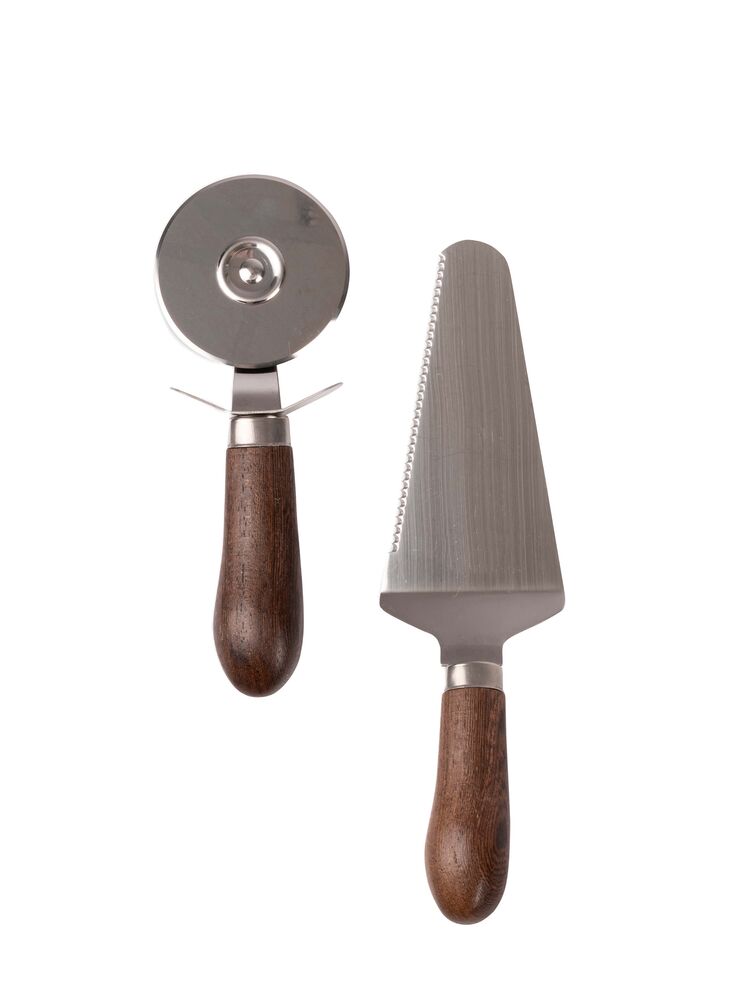 Uansett om pizzaen er hjemmelaget eller kjøpt, trengs dette settet i kjøkkenskuffen! Pizzasett med skjærer og spade i vår favorittkombinasjon av rustfritt stål og vakkert buet håndtak i sjokoladebrunt wenge tre. Kombinasjonen blir spennende – en klassiker men med et tøffere preg. Fungerer selvfølgelig like godt til paien.