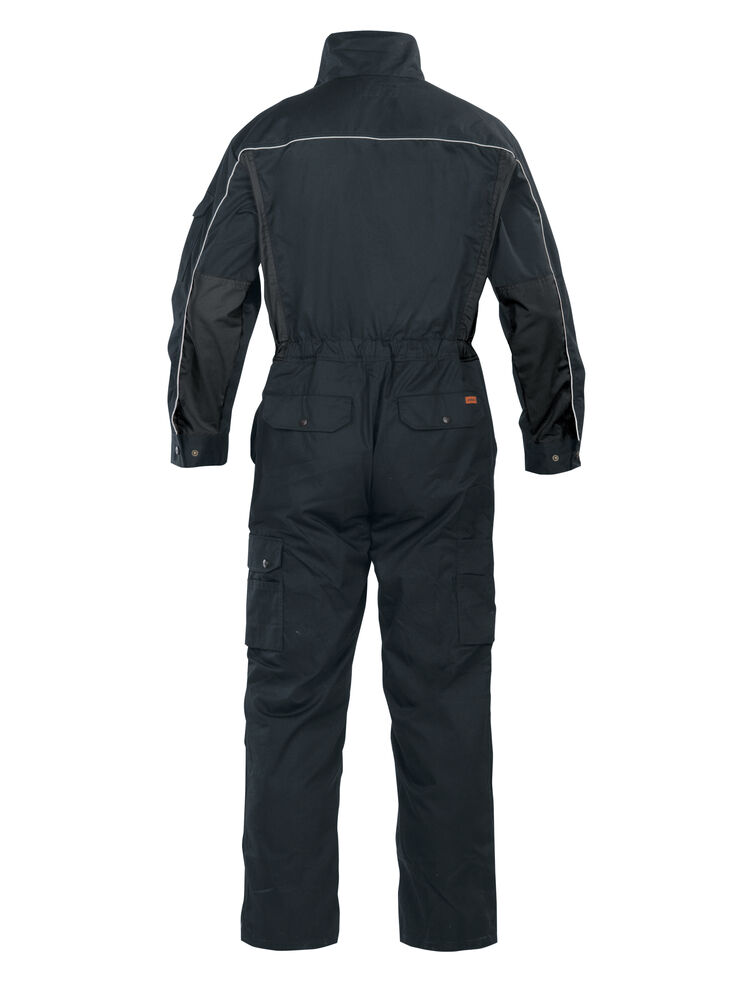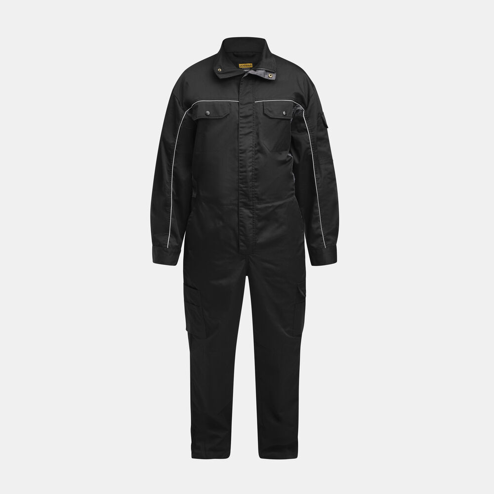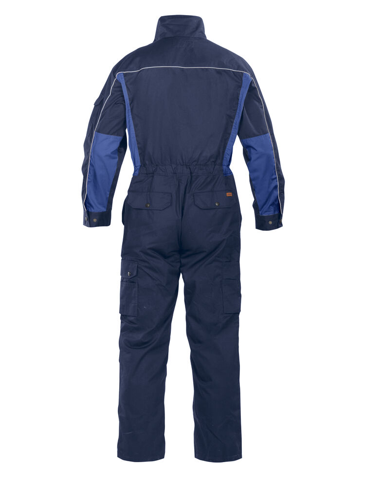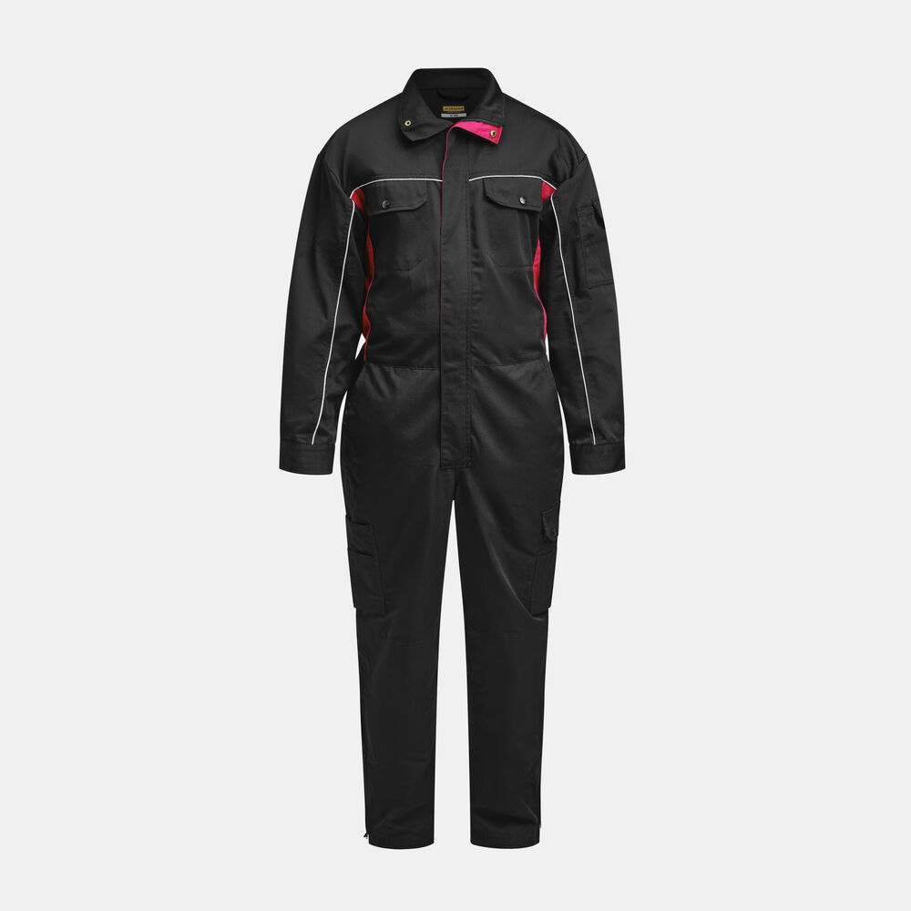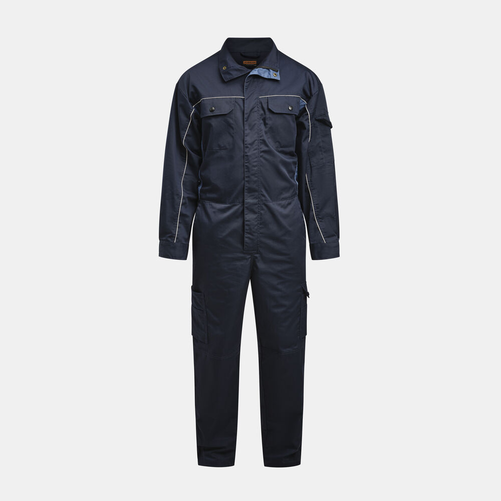 Basisfunksjoner som passer for serviceyrker og verksteder. Industrivask 85 °C. Skjult toveis glidelås. Brystlommer med klaff. Baklommer med klaff. Innsydde lommer foran. Slisse i siden. Regulerbar strikk i midjen. Regulerbart erme med trykknapp. Åpen benlomme med ekstra rom og tommestokklomme. Benlomme med klaff og mobiltelefonlomme. Innvendige knelommer. Glidelås opp til knærne på bena.