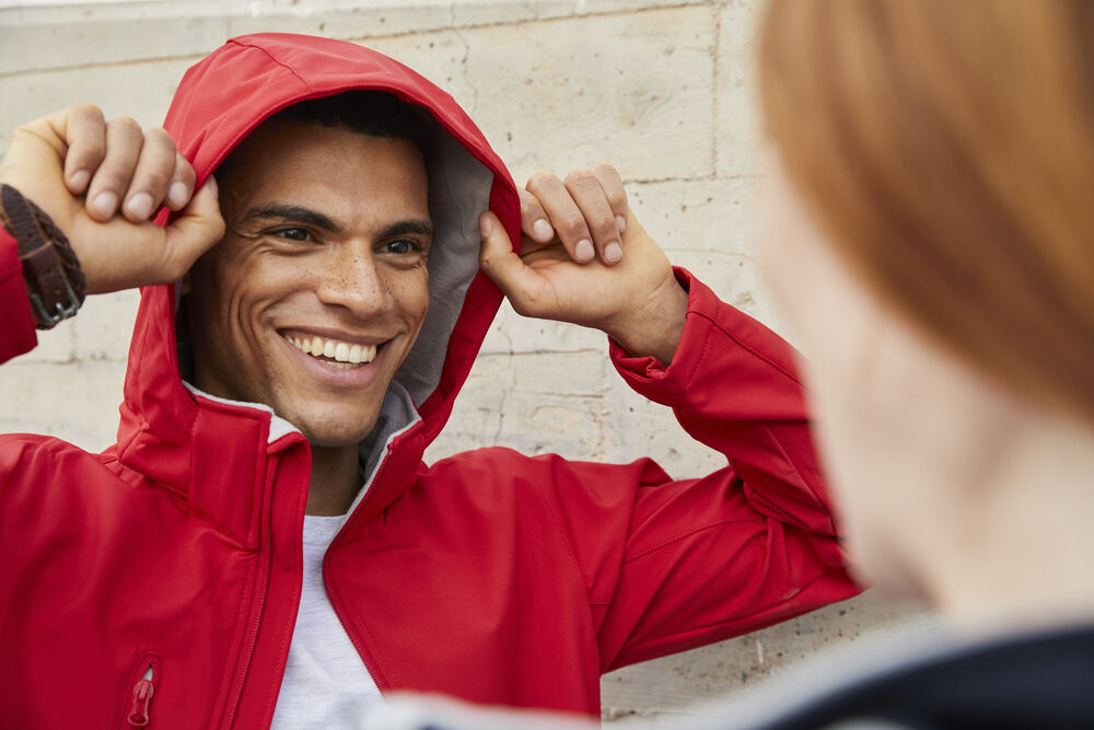 Softshelljakke med avtagbar hette, tre ytterlommer med glidelås og to innerlommer. Ton-i-ton glidelåser. Borrelås nederst på ermet.