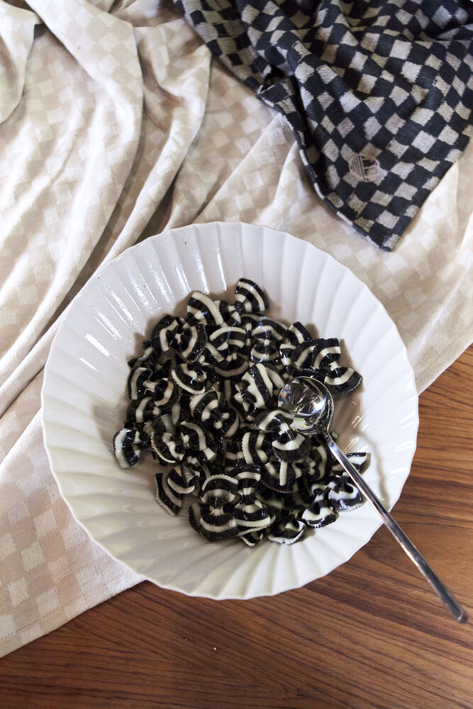 Checki servietter tilhører ByOn’s serie med servietter og duker med de lekne og litt rotete rutene. Rutene som har tatt en åpenbar plass i ByOn’s samling, vil fremover ha en sentral rolle på alle bord. Serien er laget av myk økologisk bomull og har som formål å brukes over tid til både hverdag og fest. Rolige men herlige fargekombinasjoner i sort, beige og blått. Servietten har også ByOn,s monogram på den ene kanten. Tilgjengelig i 2-pakning.