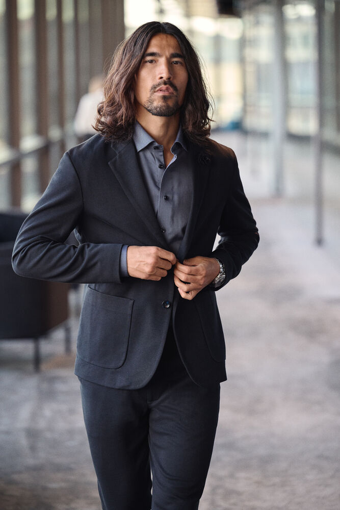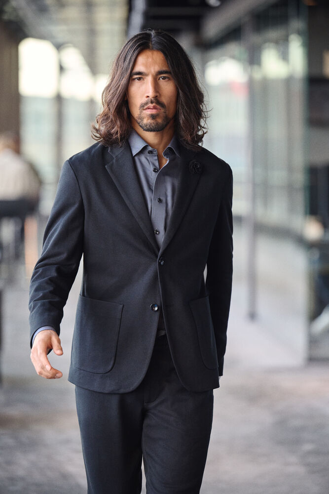 På avstand kan den se ut som en formell blazer, men på nært hold er den en myk, uformell drøm. Jerseystoffet er ekstremt behagelig, lett og elastisk.