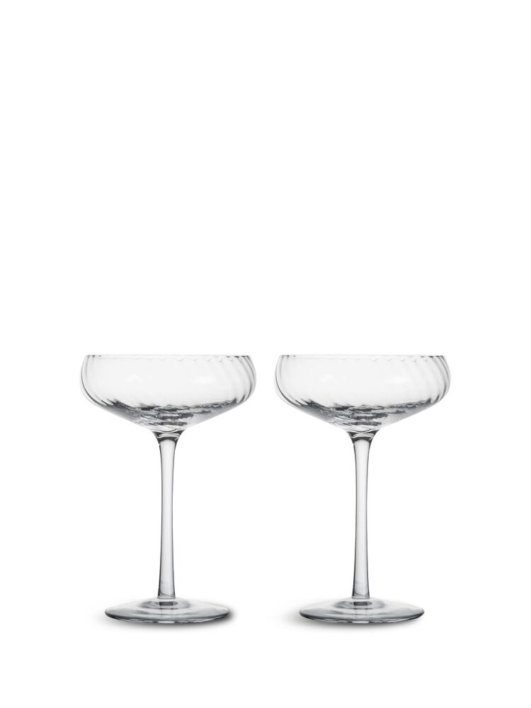 Opacity Champagne coup er designet for den perfekte opplevelsen – på bordet, i hånden og mens du drikker. Det er en tynn champagne coupe med et vakkert, virvlet glassmønster i klart glass. Kan med fordel også benyttes til dessert eller morgenjuice for en mer festlig følelse. Et design som har den perfekte kontrasten mellom luksus og selvsikkerhet. Design Byon Studio. Leveres i 2-pakninger i Byon boks.