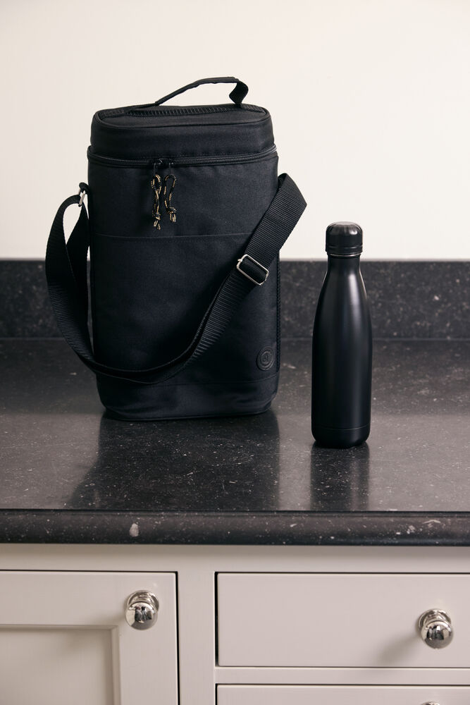 Praktisk og sporty kjøleveske i en høyere modell. Laget av svart rPET-materiale med fine, kontrastfargede detaljer. Denne litt høyere kjølevesken passer perfekt til – for eksempel – to vinflasker eller 1,5 liters PET-flasker. Har både bærehåndtak og justerbar skulderstropp. Design Studio Sagaform.