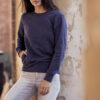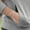 Rundhalset genser med børstet innside. 2×2 ribb med stretch i nederkant og i ermavslutning. Ton-i-ton flatlocksømmer. Skjult sidelomme med glidelås.