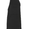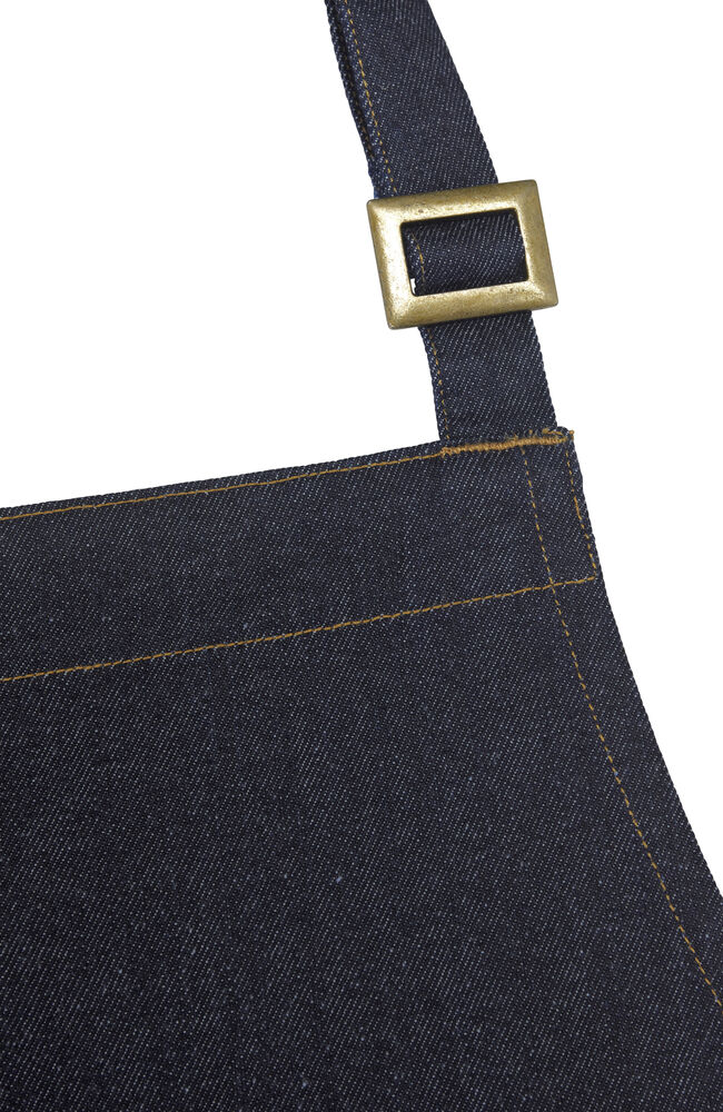 Brukes som brystforkle med justerbar nakkestropp, eller som midjeforkle da smekken kan brettes ned og skjules. Ton-i-ton sømmer. Forkledet i denim har gule sømmer.