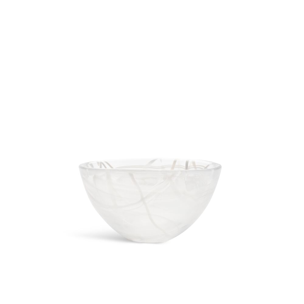 Contrast fra Kosta Boda er laget ved hjelp av en teknikk som kalles sentrifugering, som skaper et slør av farger inne i glassmassen. I kombinasjon med fargede glasspinner som tilsettes i prosessen, blir hvert produkt unikt. Den lille bollen passer perfekt til snacks eller annet tilbehør. Design Anna Ehrner.