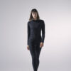 Settet er laget av et mykt, kanalstrikket funksjonelt materiale som gir effektiv fukttransport og god regulering av kroppstemperaturen under intense aktiviteter. Flate sømmer følger kroppens bevegelser og gir god komfort.