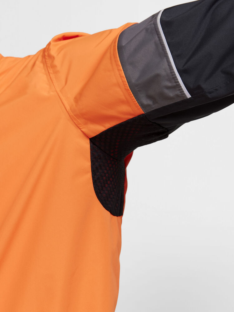 Jakken er laget av et vind- og vannavstøtende materiale og har teipede sømmer som bidrar til optimal værbeskyttelse. Sykkeljakken har også ventilerende mesh i armhulene, børstet fleece på innsiden av kragen og elastisk bånd i mansjettene og i nederkant som blokkerer for regn og vind.