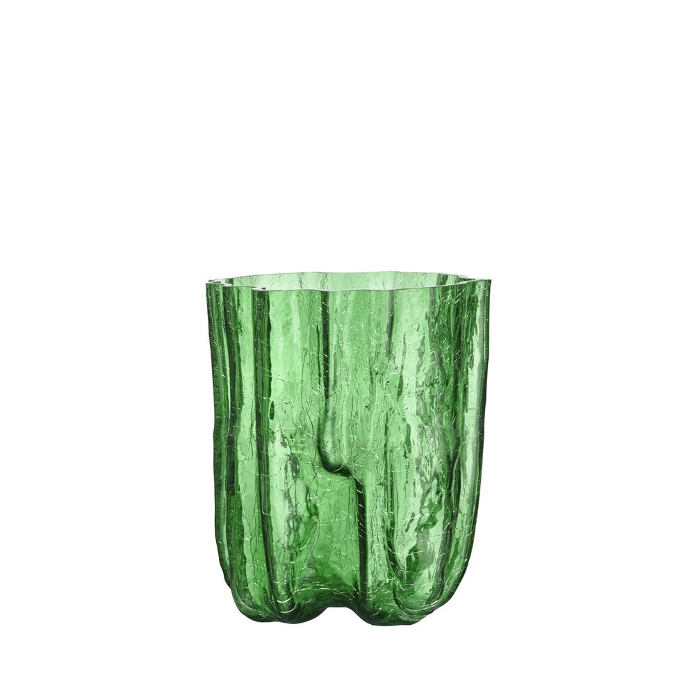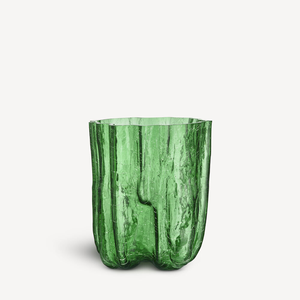 Knatring og torden – et magisk vidunder. Hos Kosta Boda undrer vi oss over vakkert bevarte sprekker i glass. Den grønne vasen fra Crackle-kolleksjonen har et uttrykksfullt, skulpturelt ytre laget med en gammel håndverksteknikk der det varme glasset dyppes i iskaldt vann. Den krakelerte overflaten reflekterer dagslyset og avslører historiene om ild, jord og vann. Vasen er munnblåst i Kosta og designet av Åsa Jungnelius.