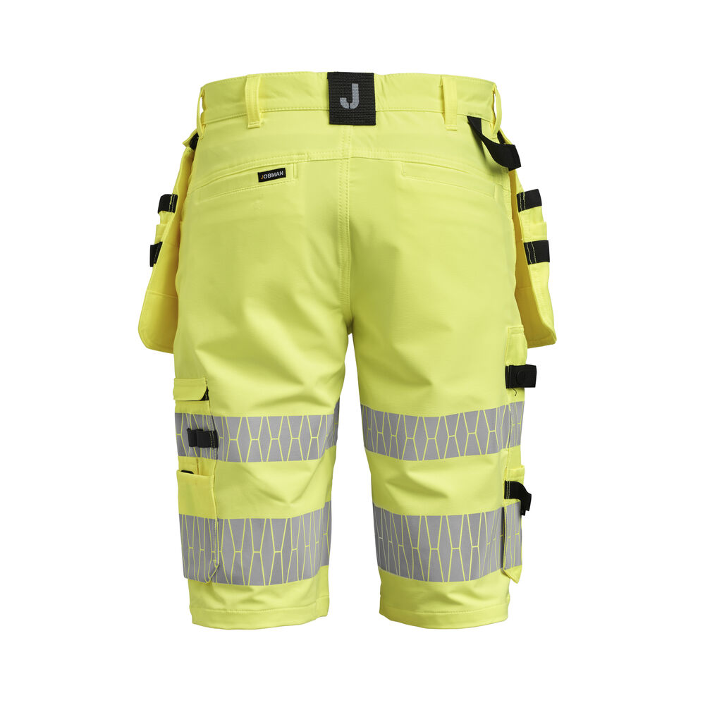 Håndverksshorts i 4-veis stretch med partier av slitesterkt vevd tøy i benlommer og hengelommer. Avtagbare hengelommer med glidelås og forsterket innside. Kan puttes i frontlommene. Midjebånd med stretch. Pene stolpelommer bak. Hammerhank. Tommestokklomme med knivholder. Benlomme med skjult glidelås, rom for ID-kort og telefon. Påvarmet refleks, Jobman design.