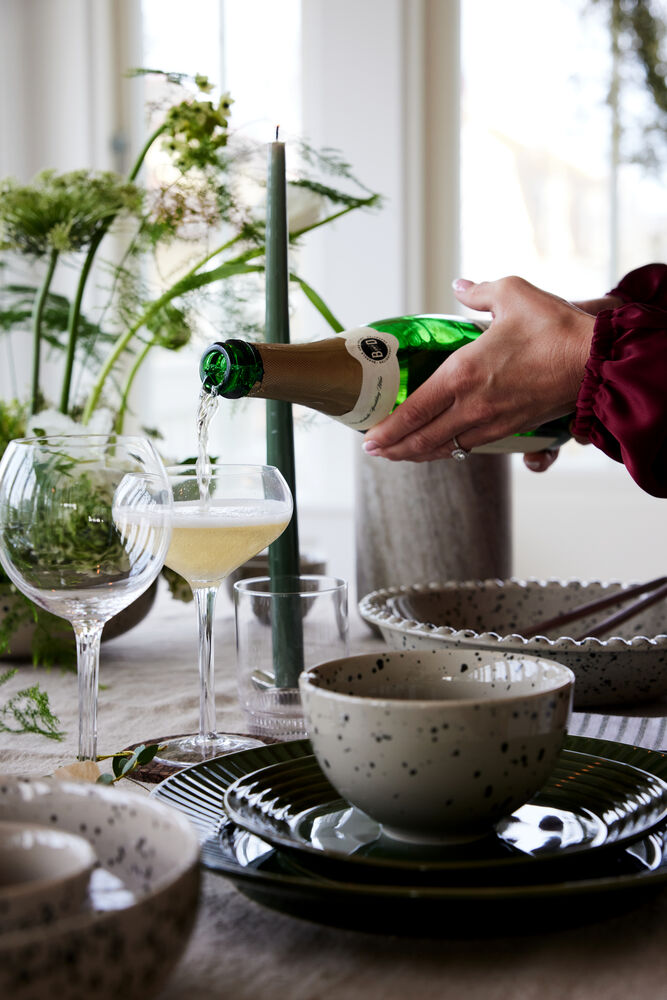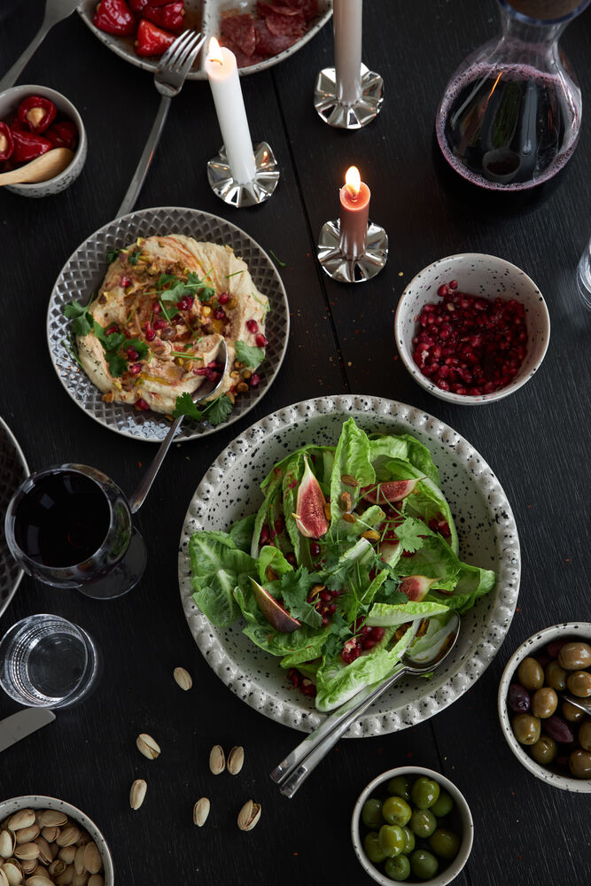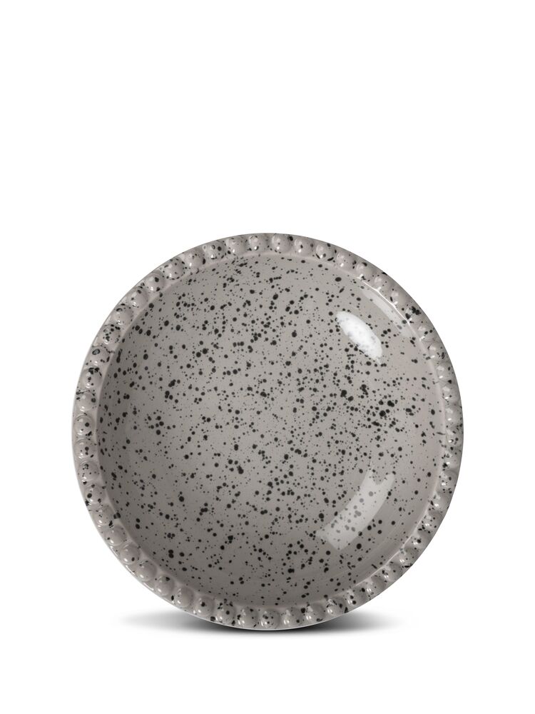 En større serveringsskål til salater, brød eller fruktsalater. Fargen er i en beige/grå tone med et fint sprutmønster i sort. Kanten er dekorert med små, runde opphøyninger. Skålen er laget av steingods og kan enkelt kombineres med Coffee & More-serien. Ditte er håndlaget – farge og overflate kan derfor variere fra et produkt til et annet. Hvert produkt er unikt i sitt slag.