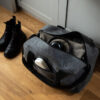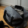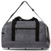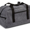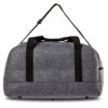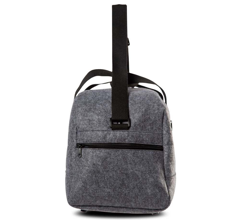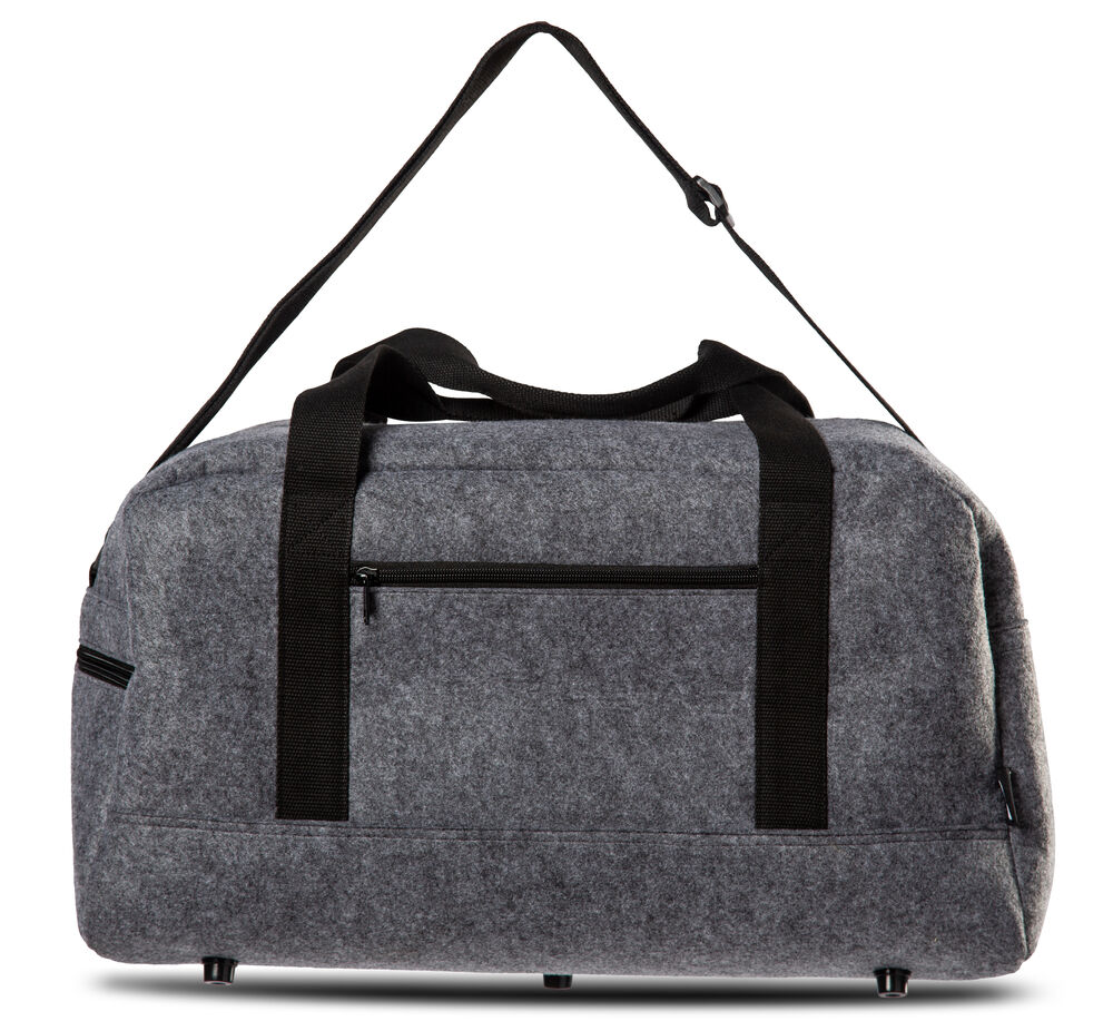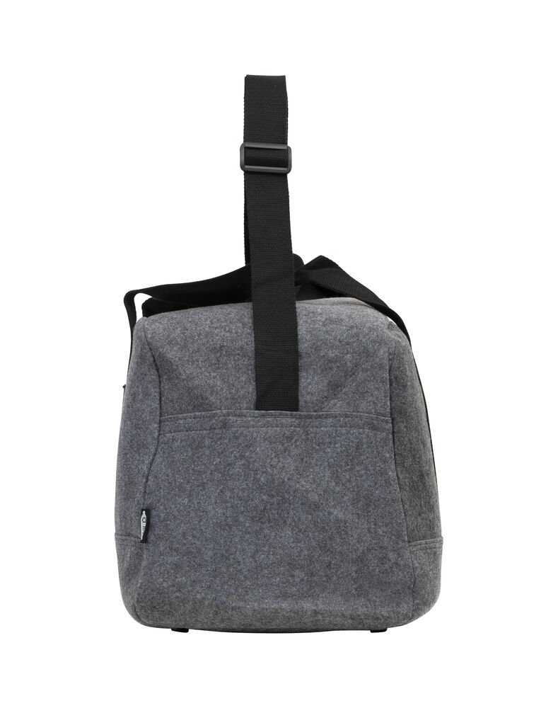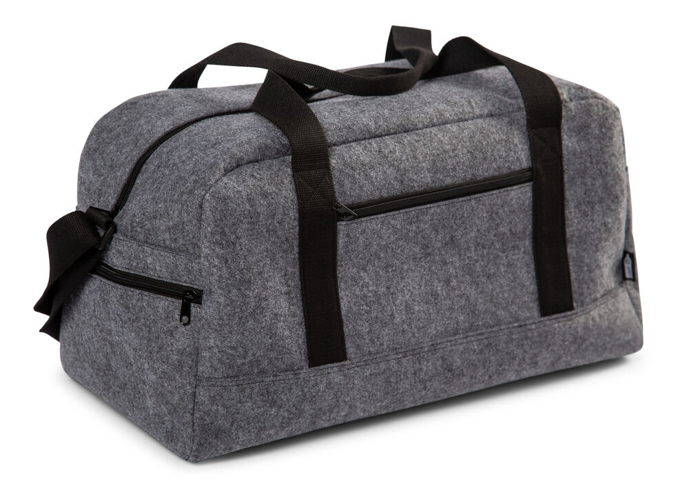 Oppdag vår praktiske og miljøvennlige duffelbag i grått filtstoff laget av 100 % R-PET. Bagen har to mindre rom, ett foran og ett på kortsiden, begge utstyrt med glidelåser for å sikre innholdet. Den stabile basen med plastknotter og den store lagringskapasiteten gjør den perfekt både for reiser og daglig bruk. Kan bæres med enten skulderreim eller håndtak.