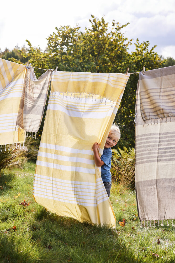 Ella Hamam er en tidløs serie bestående av servietter, håndklær, duker og vesker i tyntvevd og sertifisert økologisk bomull. Kolleksjonen er prydet med Sagaforms karakteristiske striper i ulike mønstre, og med frynser på kortsidene. Ella i gult og hvitt er en fargekombinasjon som får oss til å tenke på varme sommerdager og solmoden frukt. Et håndkle som får oss til å nyte hver dag enda litt mer.