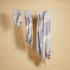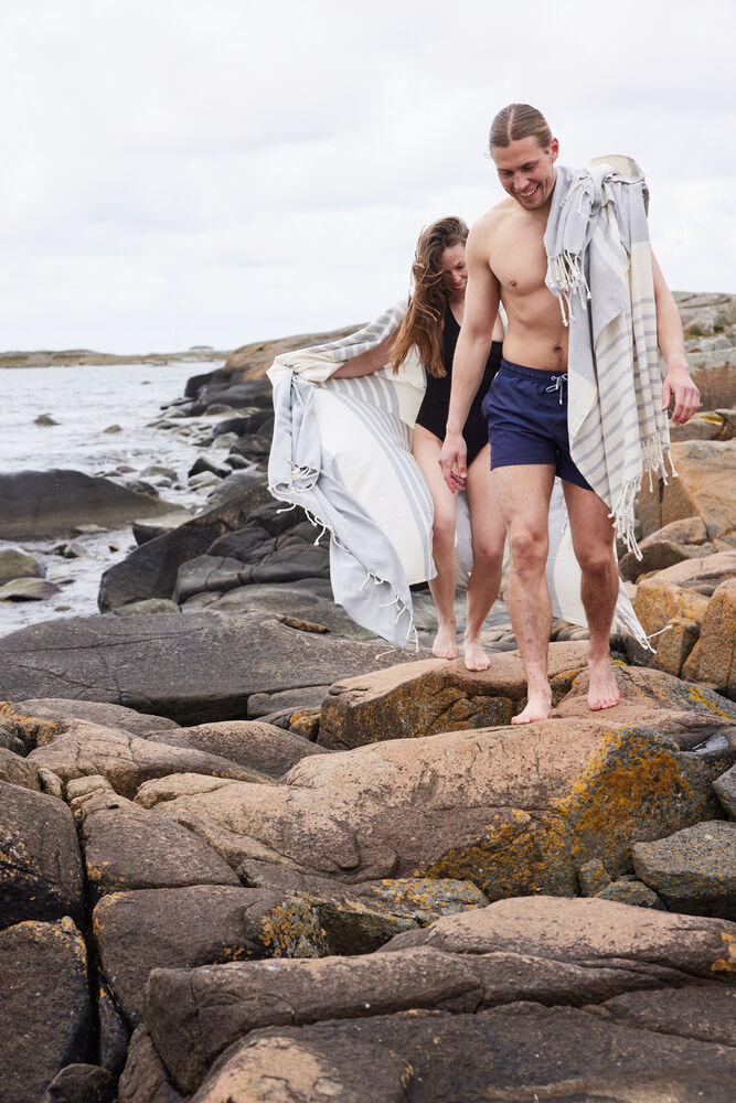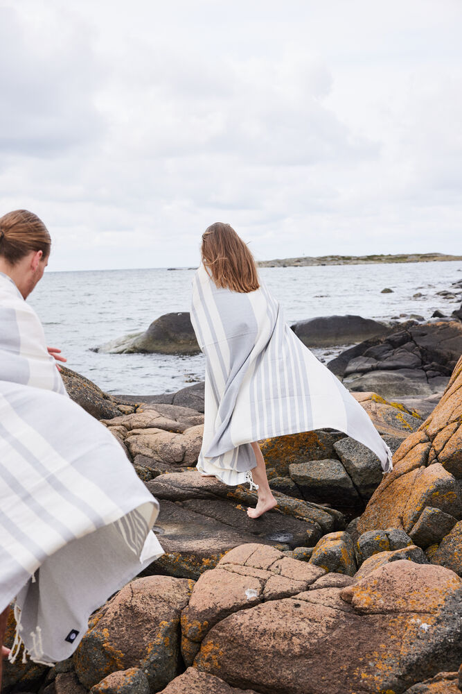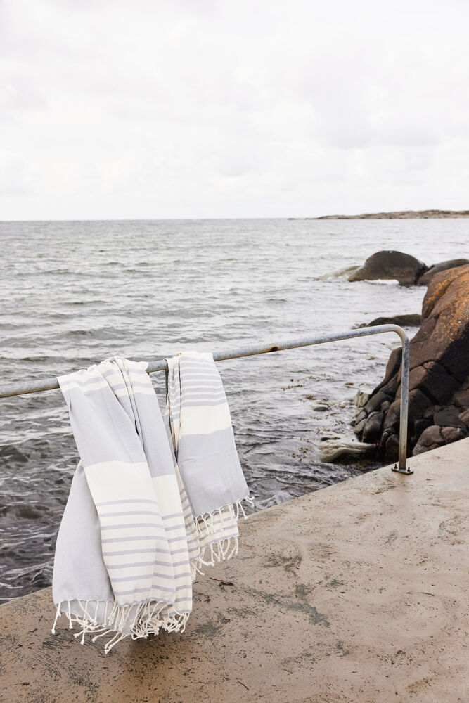 Ella hamam er et klassisk mønstret håndkle med frynser i tynn, vevd resirkulert bomull (70%) og polyester (30%). Mønsteret på stripene er karakteristisk for Sagaform – med ulike mønsterbilder for ulike farger. Tilgjengelig i myke toner av blå, grønn, gul og grå. Tørker raskt og er lett å henge opp. Enkel å rulle sammen og ta med seg til stranden, bassenget eller i treningsbagen. Passer fint sammen med Eden hamam. Tilgjengelig i størrelsene 50×70 cm, 90×170 cm og 140×250 cm. Pakket i et fint pappbånd.
