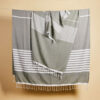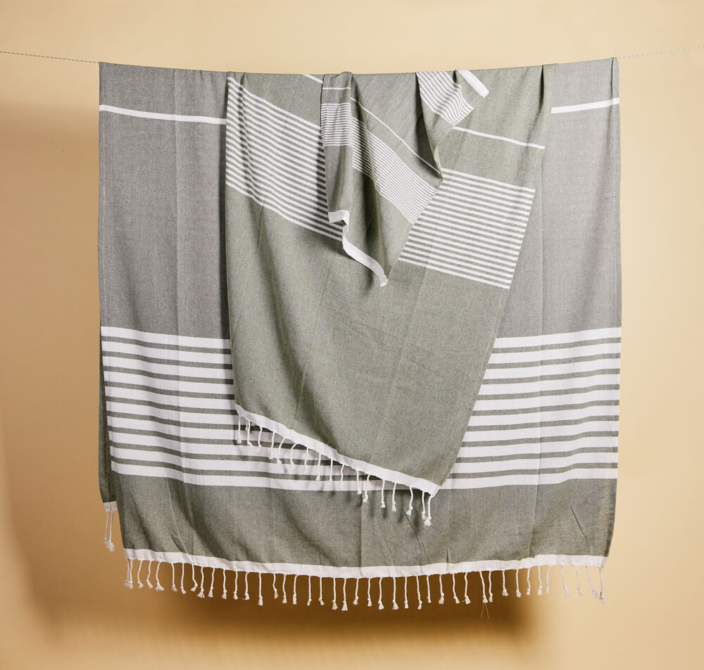 Ella hamam er et klassisk mønstret håndkle med frynser i tynn, vevd resirkulert bomull (70%) og polyester (30%). Mønsteret på stripene er karakteristisk for Sagaform – med ulike mønsterbilder for ulike farger. Tilgjengelig i myke toner av blå, grønn, gul og grå. Tørker raskt og er lett å henge opp. Enkel å rulle sammen og ta med seg til stranden, bassenget eller i treningsbagen. Passer fint sammen med Eden hamam. Tilgjengelig i størrelsene 50×70 cm, 90×170 cm og 140×250 cm. Pakket i et fint pappbånd.