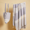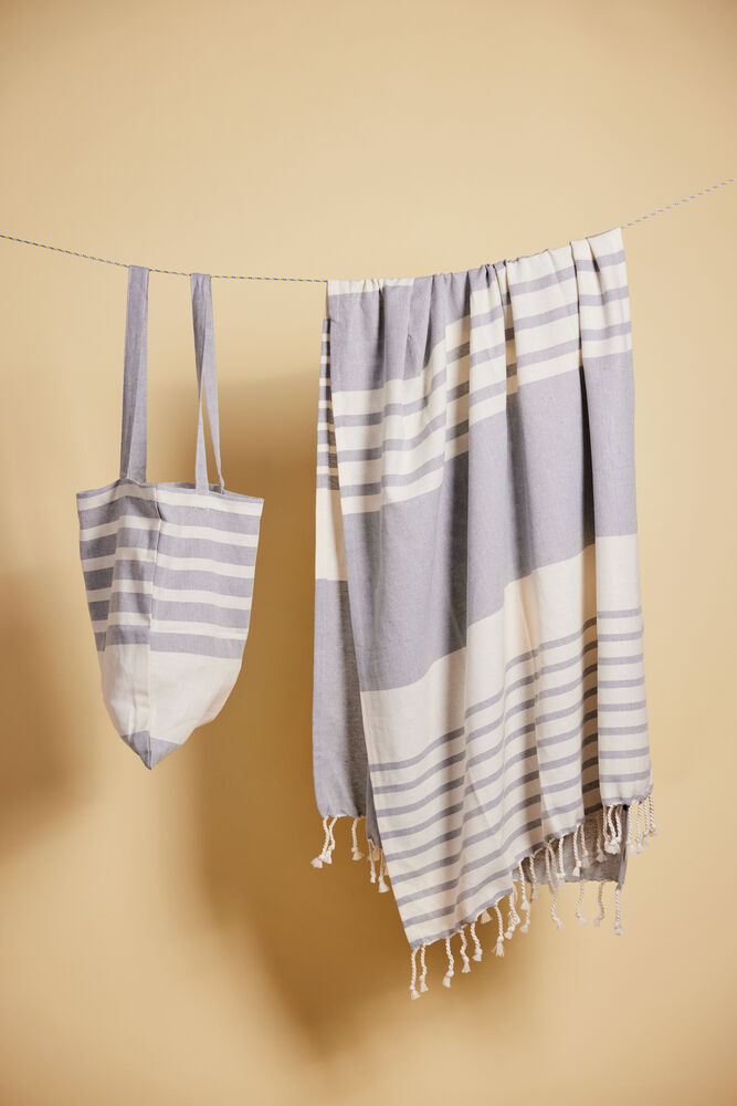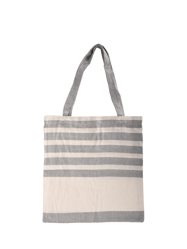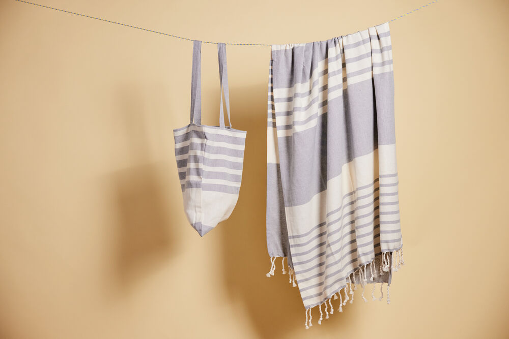 Av stoffet fra vår vakre serie Ella hamam har vi også laget matchende vesker i tynn resirkulert bomull (70 %) og polyester (30 %). Bruk dem på stranden, på jobb eller i byen. Like vakre uansett hvilket miljø du velger å bruke dem. Alle veskene er dekorert med Sagaforms klassiske og karakteristiske striper i ulike mønstre og i fire fargekombinasjoner: grønn, blå, gul og grå.