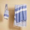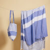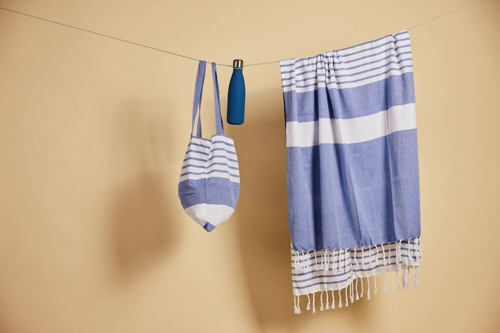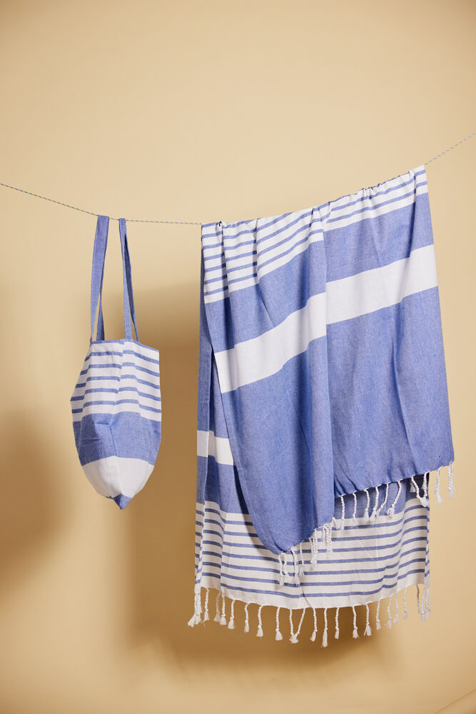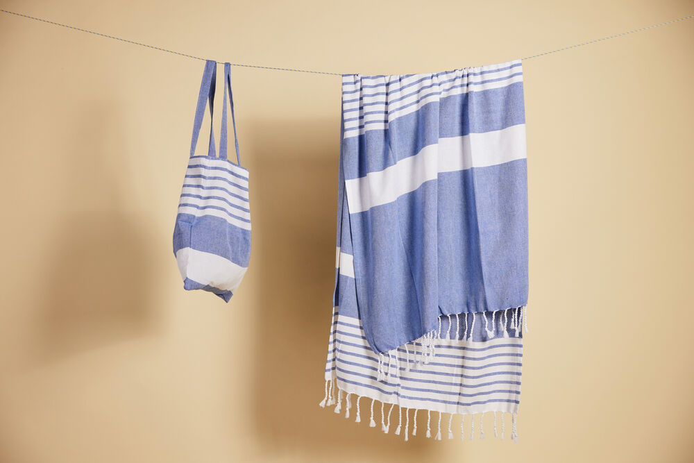 Av stoffet fra vår vakre serie Ella hamam har vi også laget matchende vesker i tynn resirkulert bomull (70 %) og polyester (30 %). Bruk dem på stranden, på jobb eller i byen. Like vakre uansett hvilket miljø du velger å bruke dem. Alle veskene er dekorert med Sagaforms klassiske og karakteristiske striper i ulike mønstre og i fire fargekombinasjoner: grønn, blå, gul og grå..