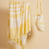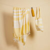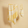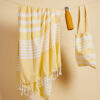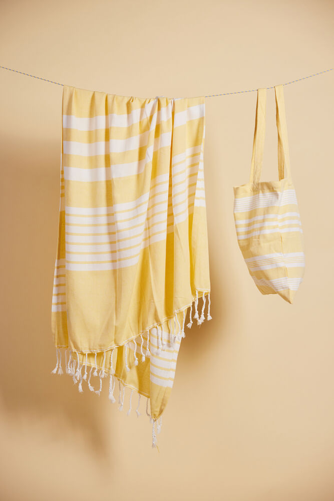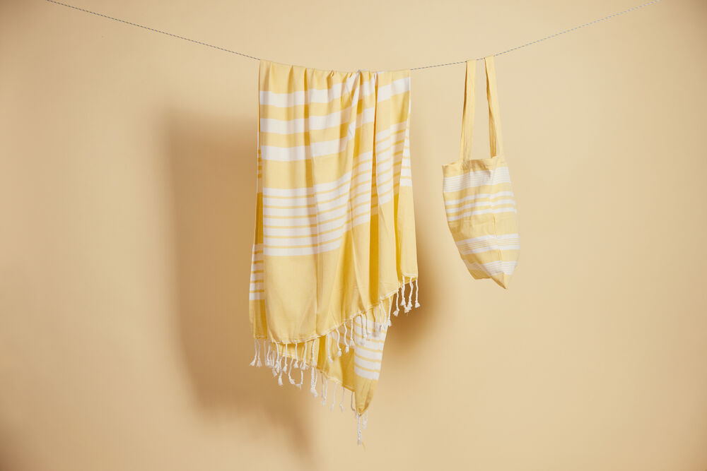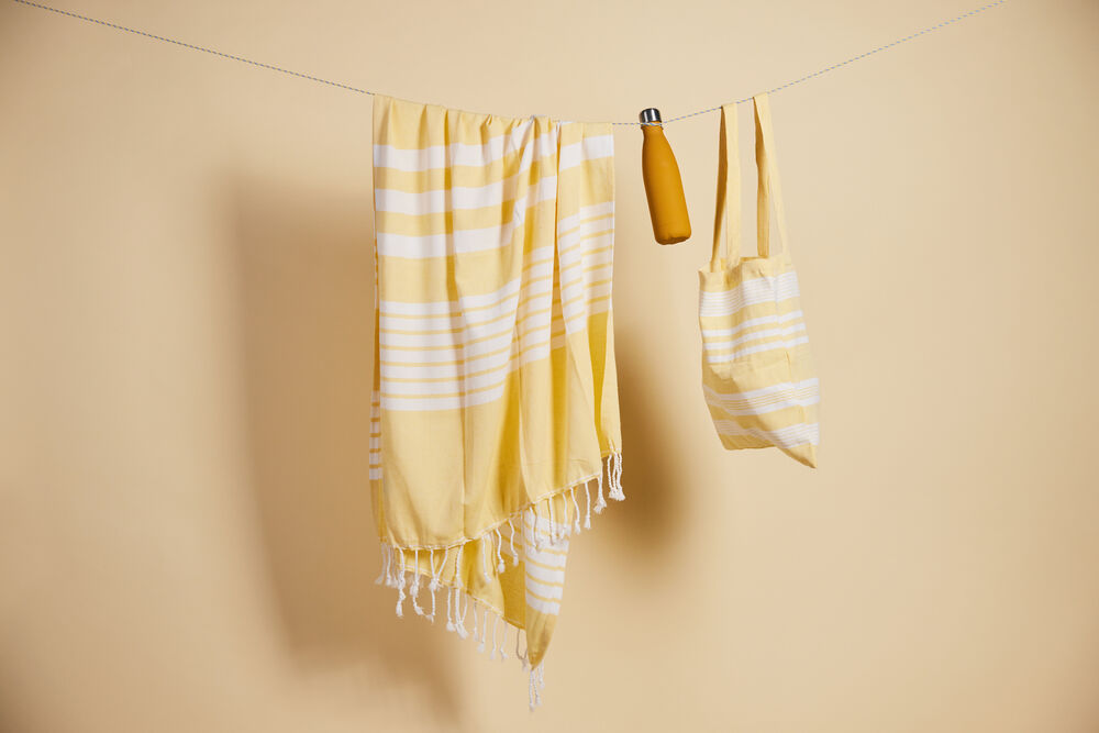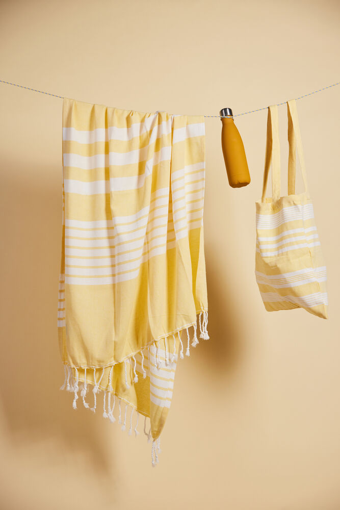 Av stoffet fra vår vakre serie Ella hamam har vi også laget matchende vesker i tynn resirkulert bomull (70 %) og polyester (30 %). Bruk dem på stranden, på jobb eller i byen. Like vakre uansett hvilket miljø du velger å bruke dem. Alle veskene er dekorert med Sagaforms klassiske og karakteristiske striper i ulike mønstre og i fire fargekombinasjoner: grønn, blå, gul og grå.