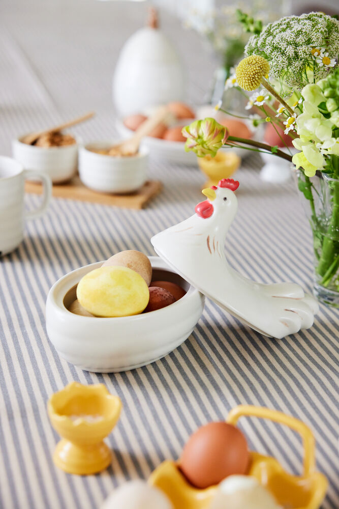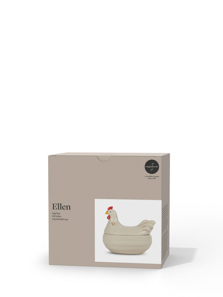 Egghønen Ellen fra Sagaform er inspirert av tradisjoner fra fortiden. Servering av kokte påskeegg i spesielle egghøner ble populært allerede på slutten av 1800-tallet, en tradisjon det er verdt å fremheve og ta vare på. I tillegg til kokte egg på påskebordet, fyller vi det gjerne med søtsaker og annet godt som vi vil gjemme. Laget av steingods i fargen off-white. Leveres i gaveeske. Rommer 40 cl. Ellen egghøne tilhører serien Ellen, som er en gitt Sagaform-klassiker med stilig design. Serien fungerer like bra hele året, til hverdagsbruk så vel som under våre kjære høytider og tradisjoner.