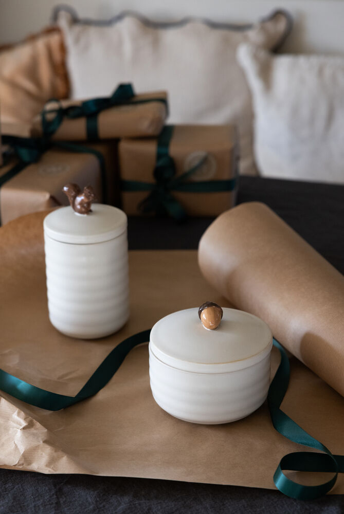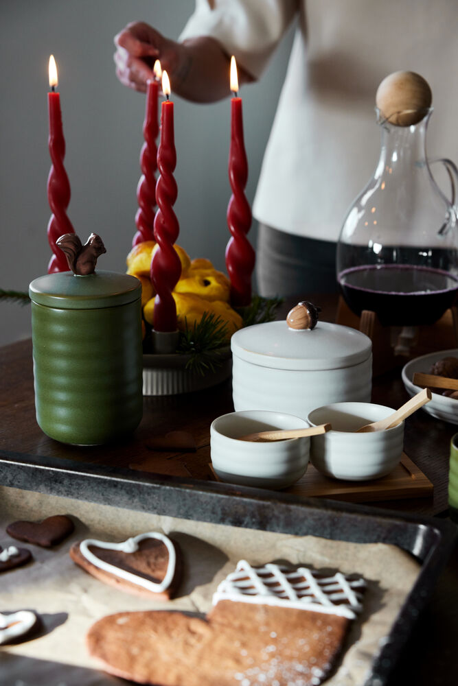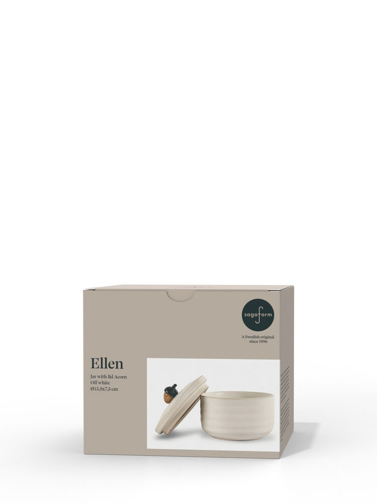 Krukker er perfekte gjemmesteder for ting du vil ha i nærheten, men som ikke alltid er så dekorative – eller som oppbevaring for ting du vil servere raskt, enkelt og pent. Ellen-krukken fungerer usedvanlig godt på kjøkkenet, men like godt på badet eller barnerommet. En søt krukke som kommer i to naturlige farger, grønn og off-white. Finnes i to størrelser, der den store krukken har et ekorn på lokket og den lille har en eikenøtt. Laget av steintøy.
