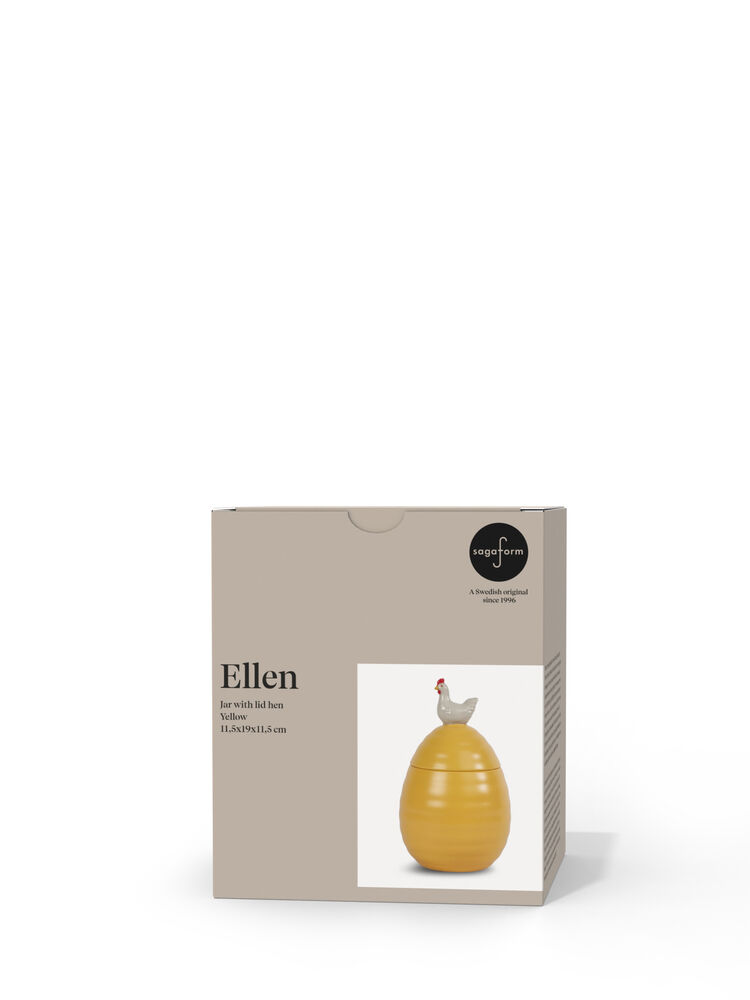 Krukker er perfekte gjemmesteder for det du vil ha i nærheten. Ellen krukke med lokk er selvsagt ikke dårligere. Før påske fyller vi den med søtsaker eller småkaker, gir den bort i gave eller beholder den for oss selv. Vi bruker den også som oppbevaring til ting vi ønsker å servere raskt, enkelt og pent. Ellen-krukken fungerer usedvanlig godt på kjøkkenet, men også på badet eller på barnerommet. En søt krukke som kommer i gult, dekorert med en høne på toppen. Krukken finnes også i offwhite farge dekorert med en hare. Laget av steingods. Leveres i gaveeske. Rommer 60 cl. Krukken tåler oppvaskmaskin, noe som forenkler rengjøring og vedlikehold.