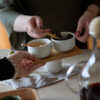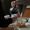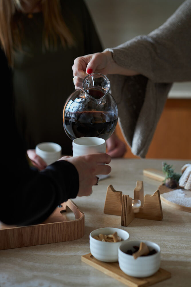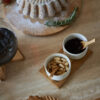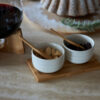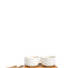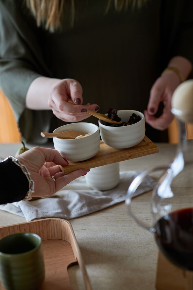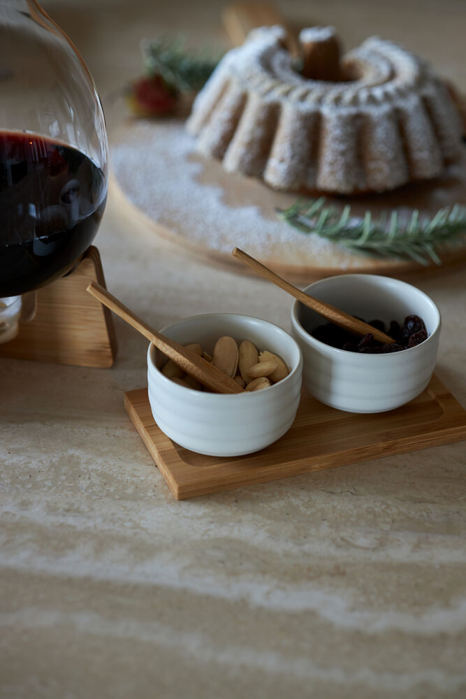 Ellen skålsett inneholer to små skåler og to skjeer på et fint lite brett av bambus. Skålene er laget av steingods i en naturlig beige farge. Perfekte små skåler til gløggtilbehør eller andre ting resten av året.