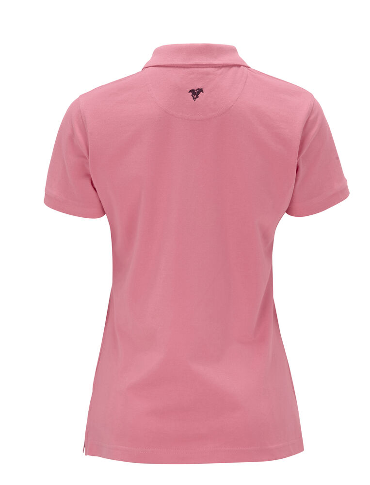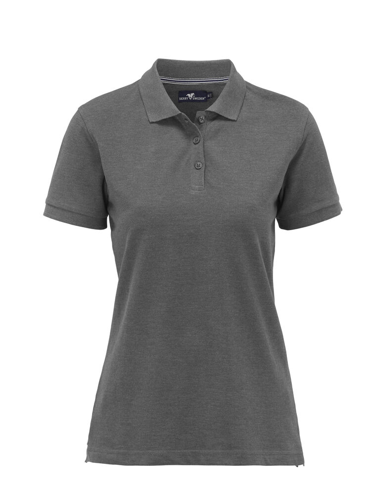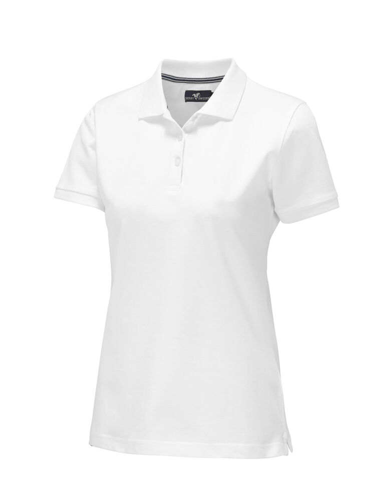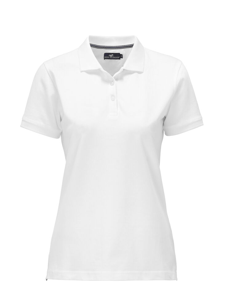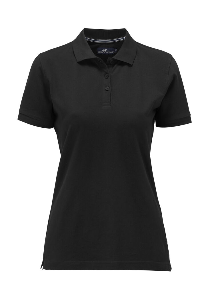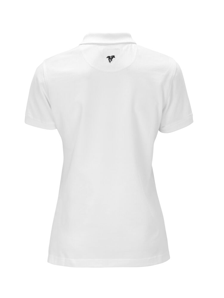 Pique med nakkebånd og splitt i siden, tre knapper på damemodellen og to på herremodellen. Brodert logo i nakken.