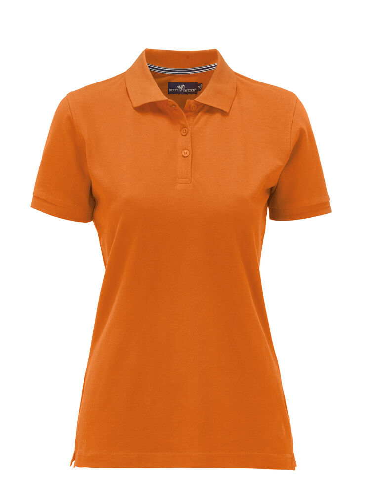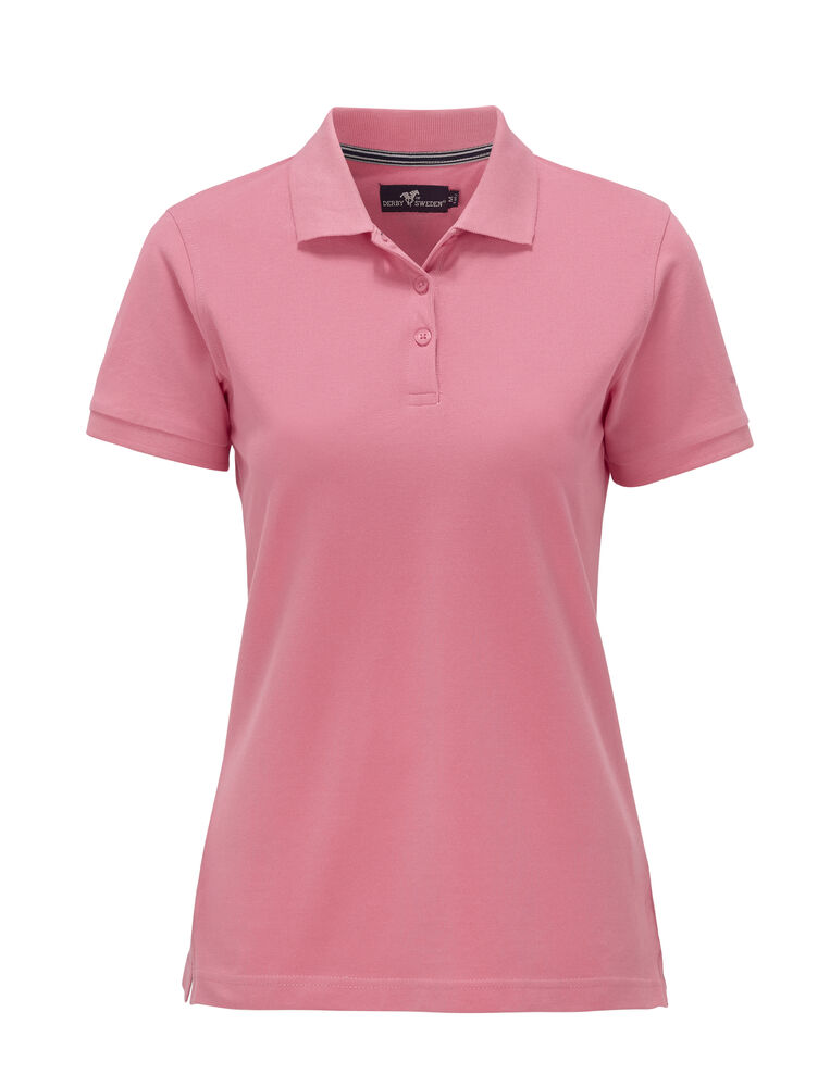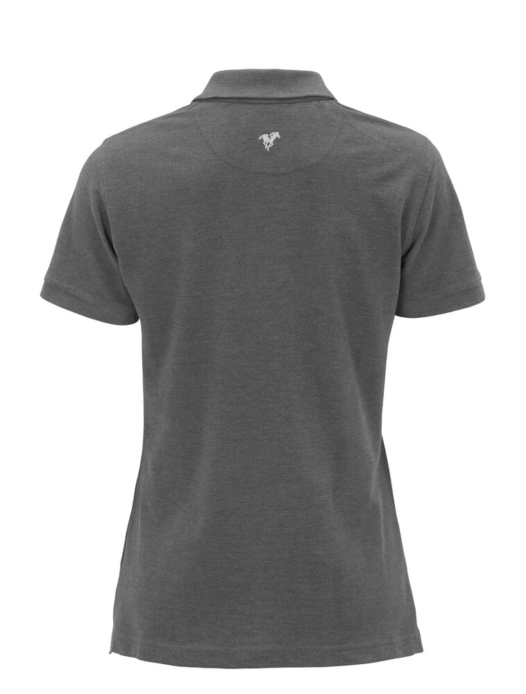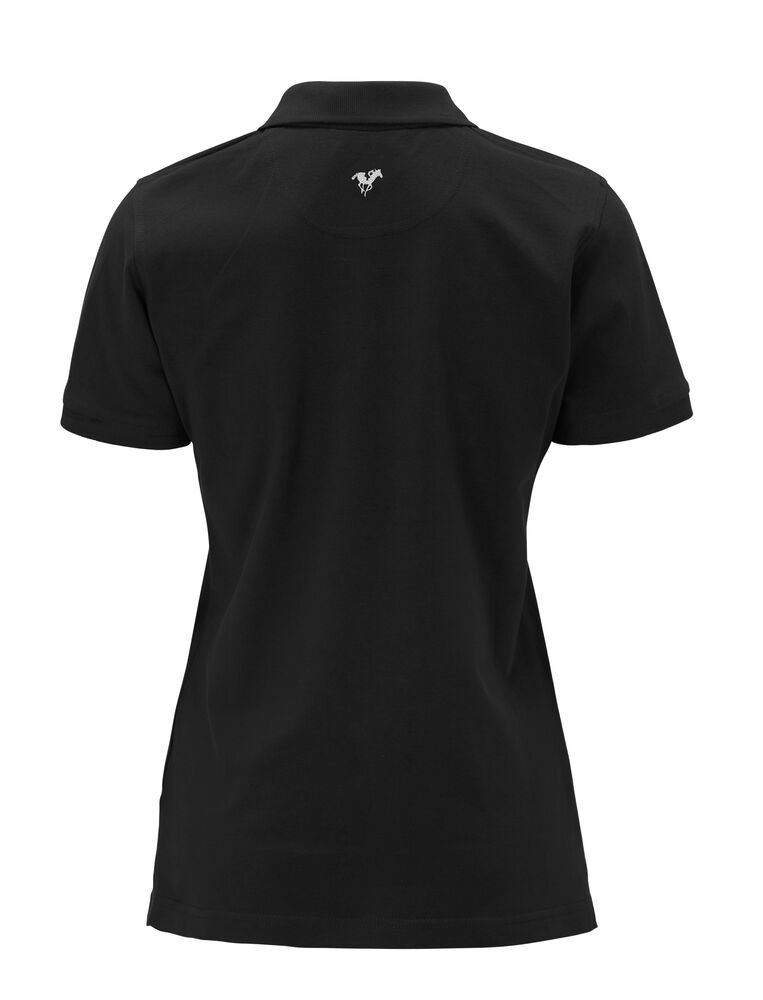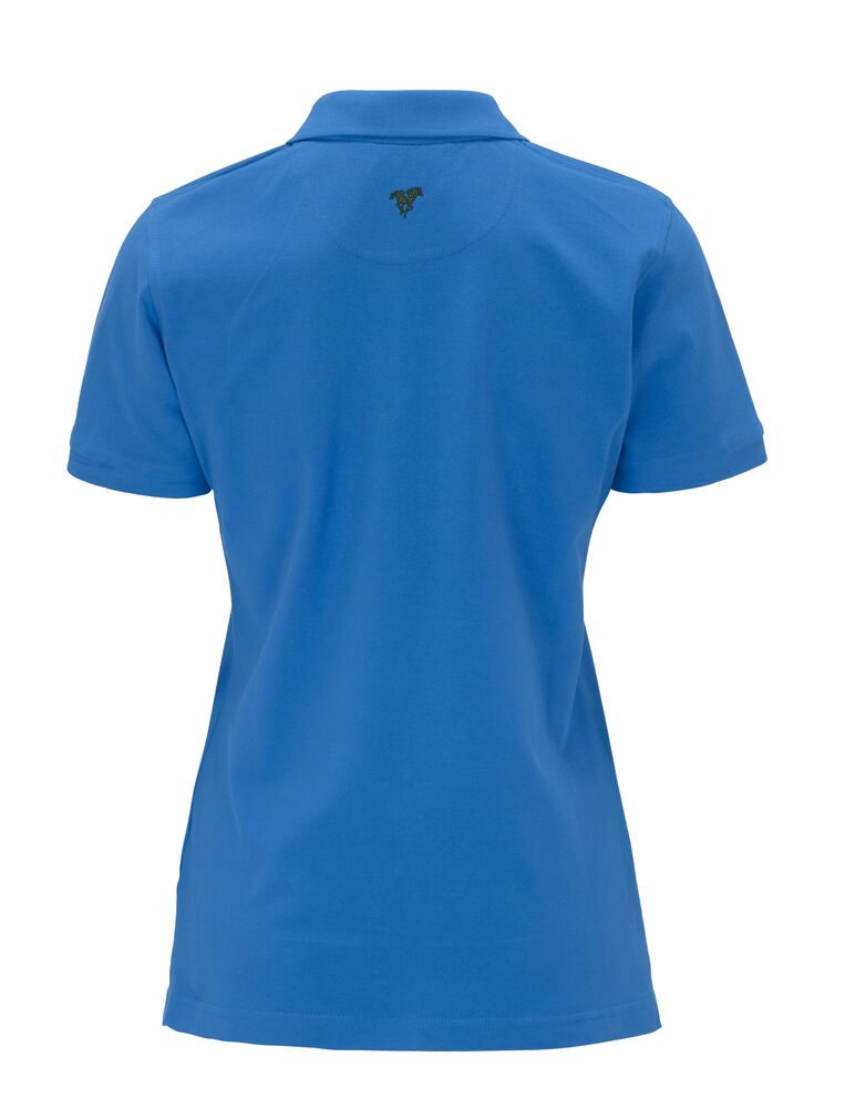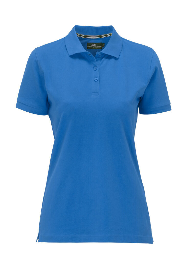 Pique med nakkebånd og splitt i siden, tre knapper på damemodellen og to på herremodellen. Brodert logo i nakken.