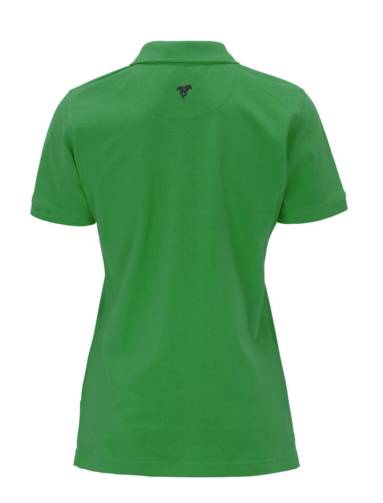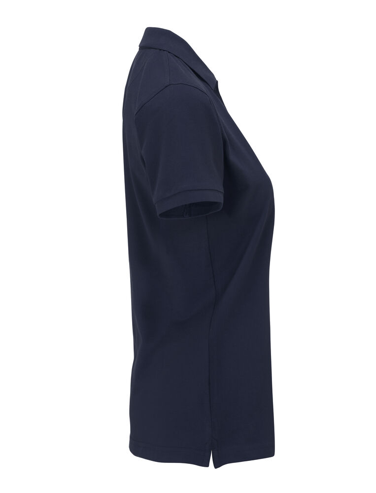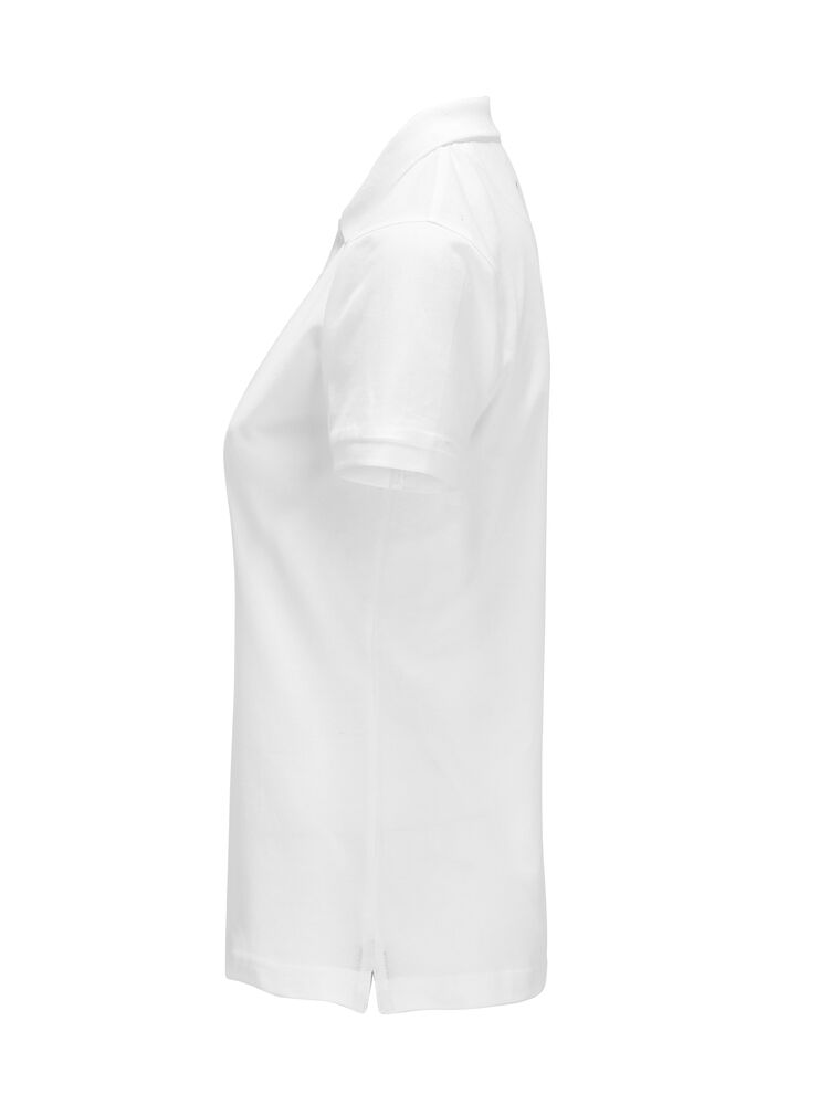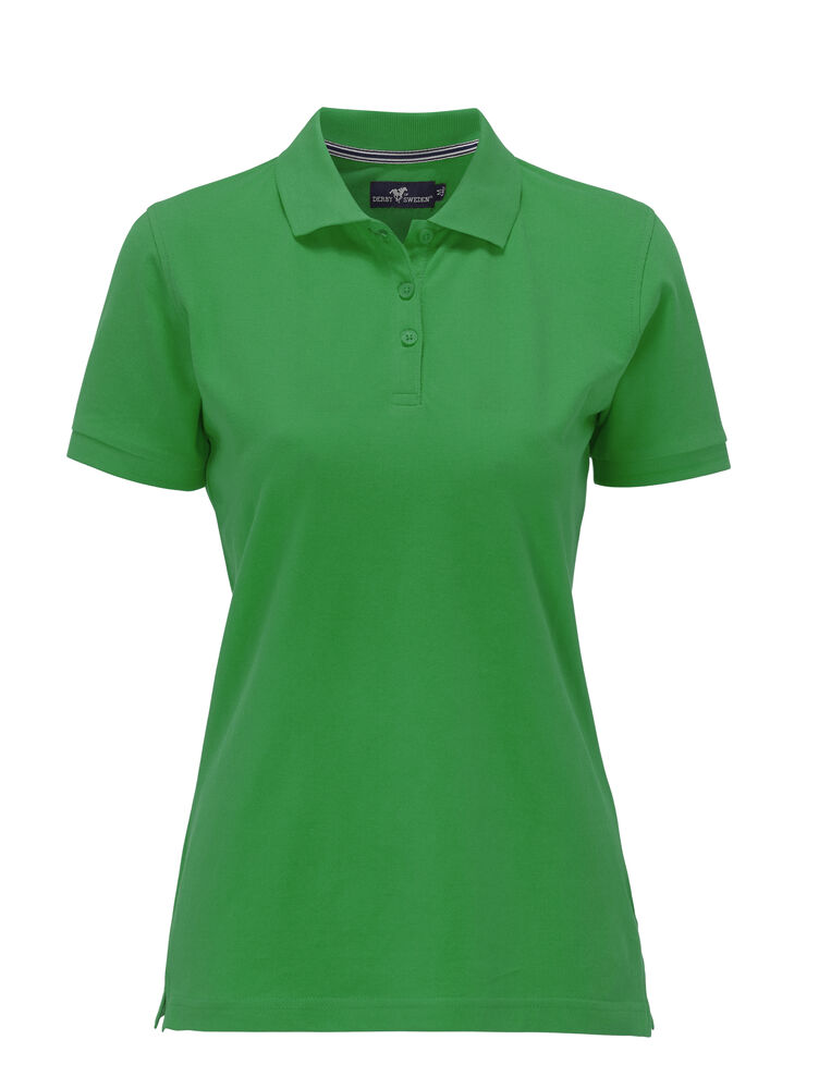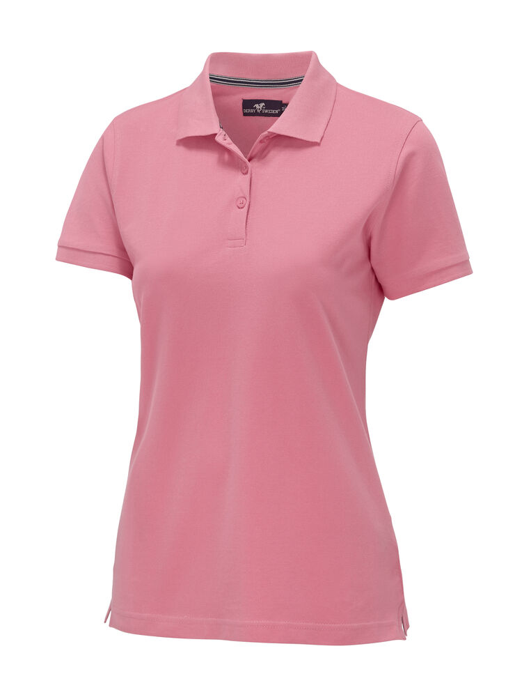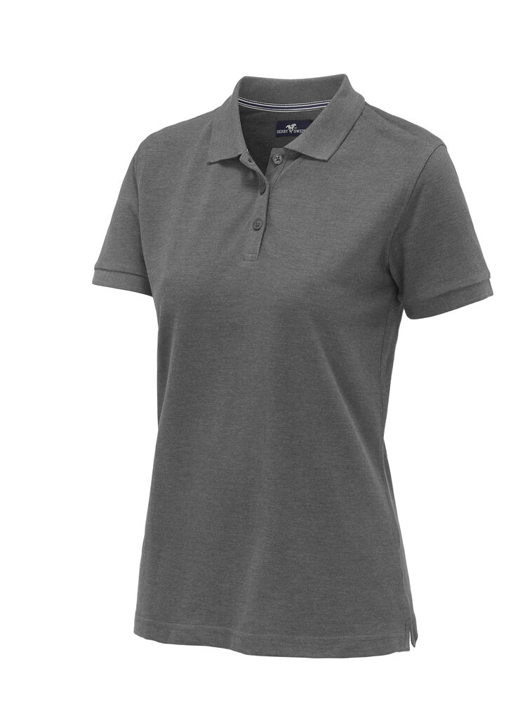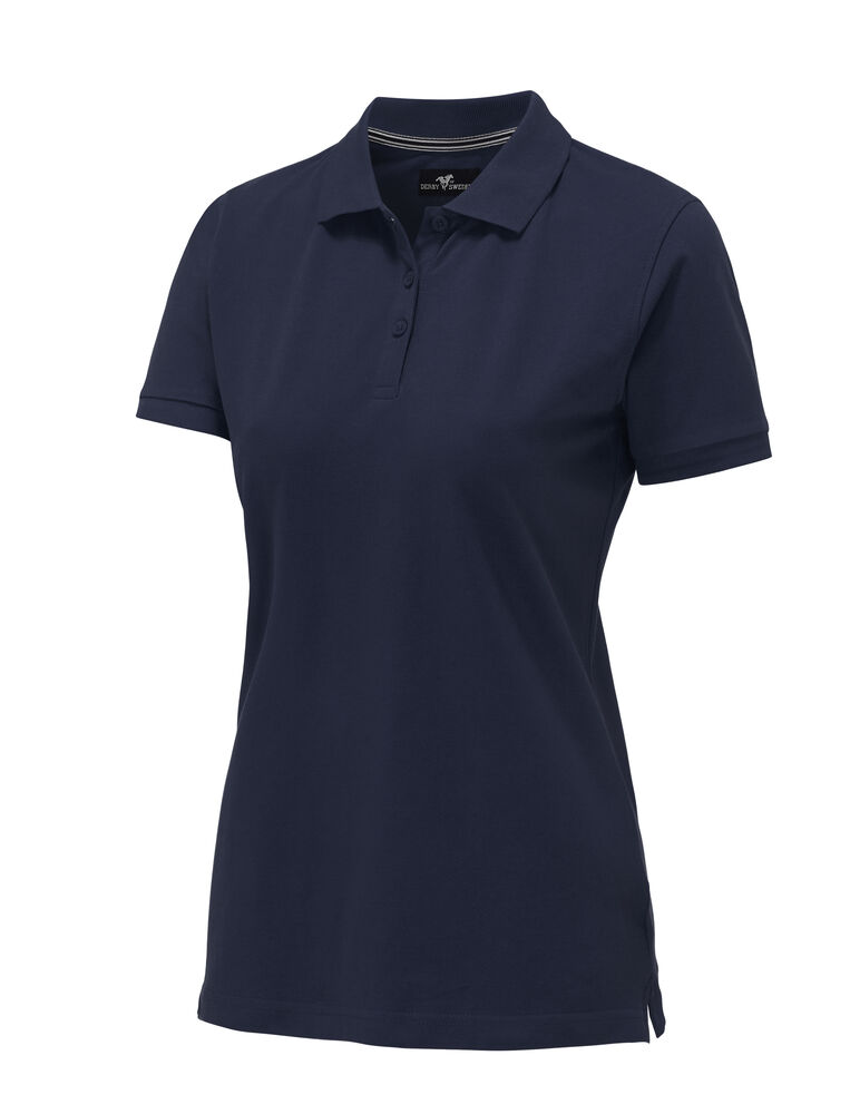 Pique med nakkebånd og splitt i siden, tre knapper på damemodellen og to på herremodellen. Brodert logo i nakken.