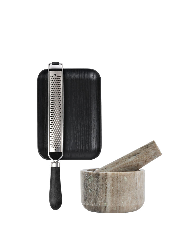 Dette eksklusive settet er rikt utstyrt med alt du trenger og litt til. Med en stenmorter laget av travertinmarmor, kjent for sin holdbarhet og slitestyrke, samt Astrid rivjern, det ultimate verktøyet for å rive grønnsaker, frukt og til og med harde matvarer som ost og sjokolade, har du alt for gourmetkjøkkenet. Dessuten inkluderes en Hanna brett i Wenge-tre fra sertifisert ansvarlig skogbruk. Dette er en gave som vil bli verdsatt i hvert hjem og som med sikkerhet vil bli brukt og nytes i lang tid fremover.
