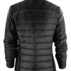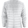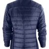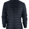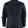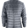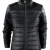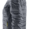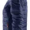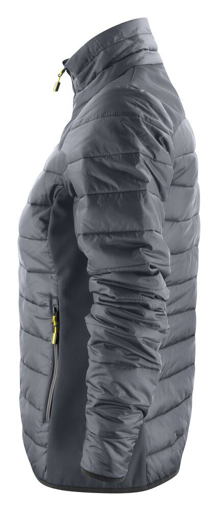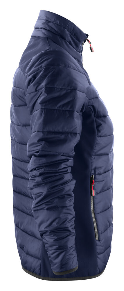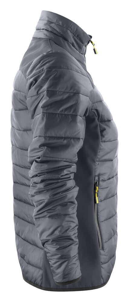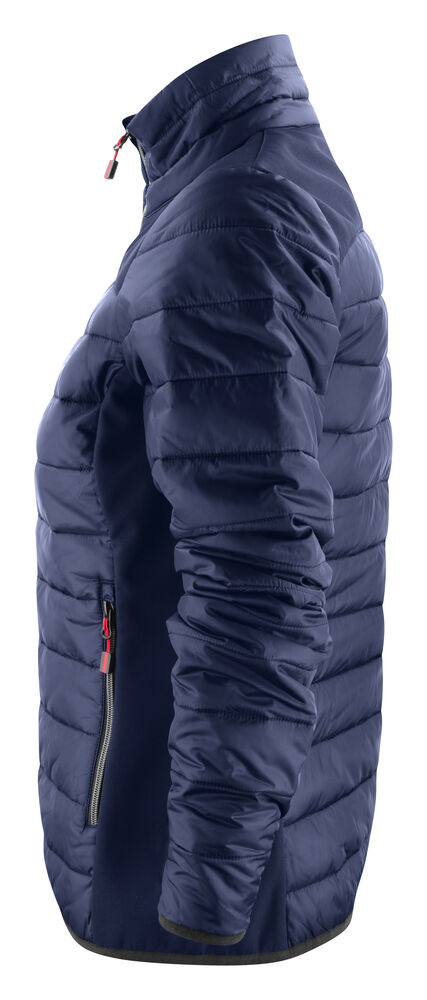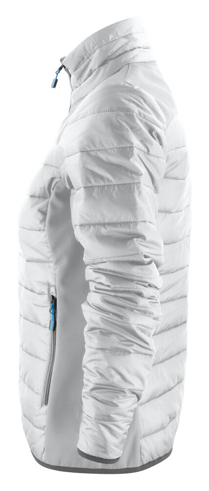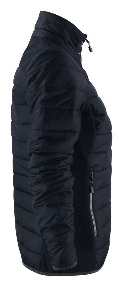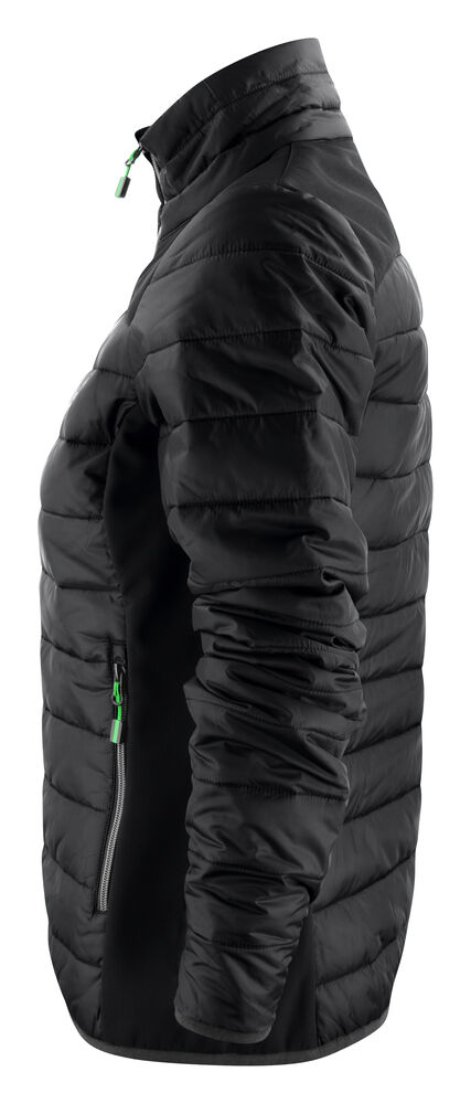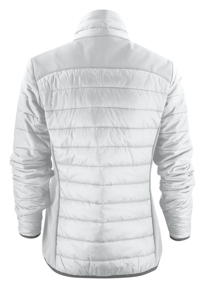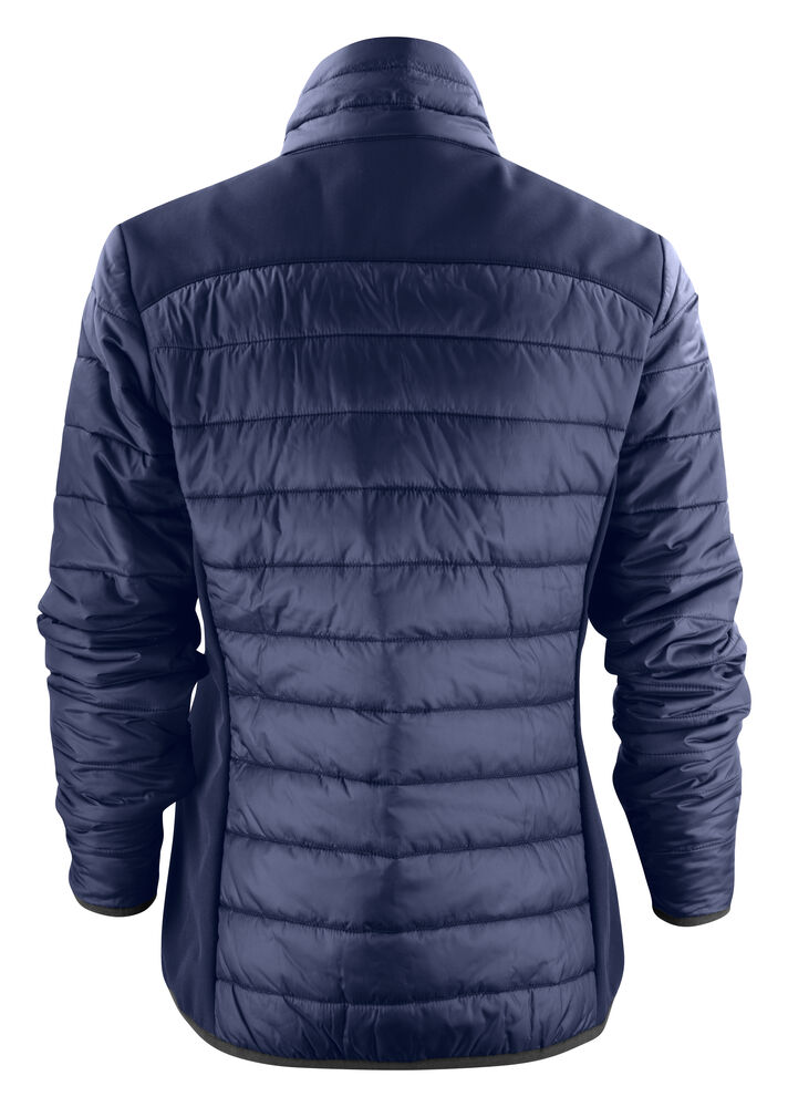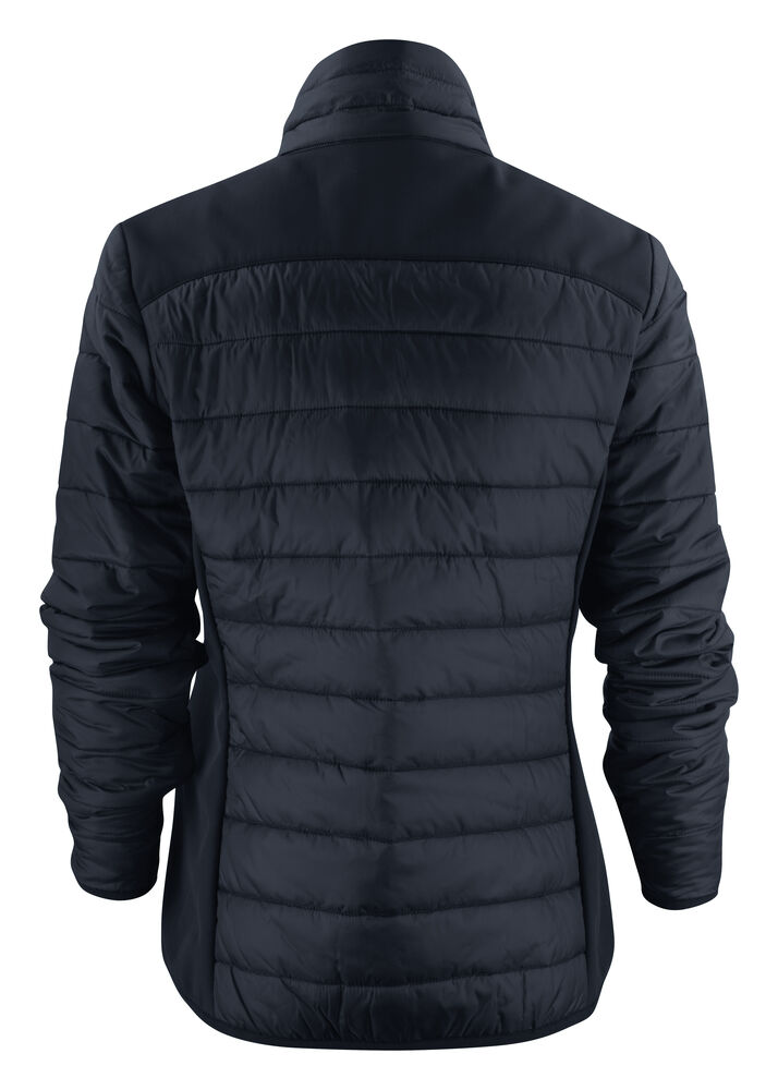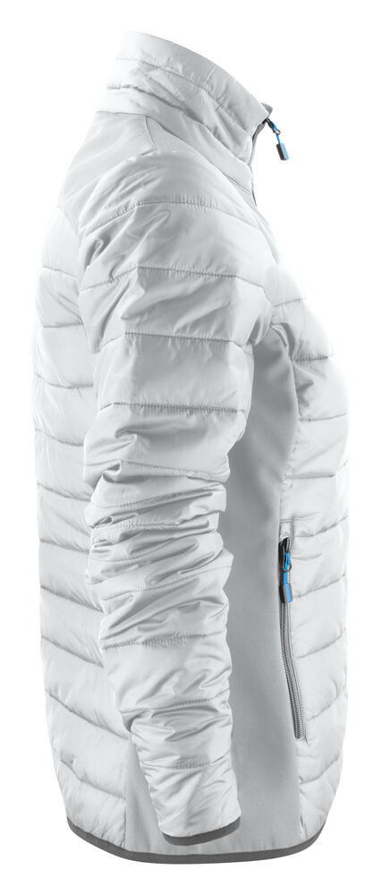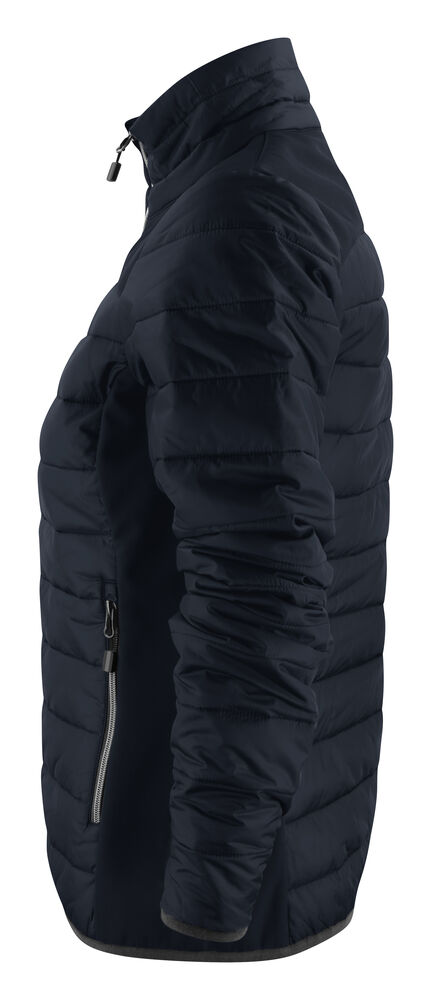 Softshell/lettvattert jakke. Sidepanelene og skulderpartiet er av softshellmateriale. Front og bakside har en lett vattering.