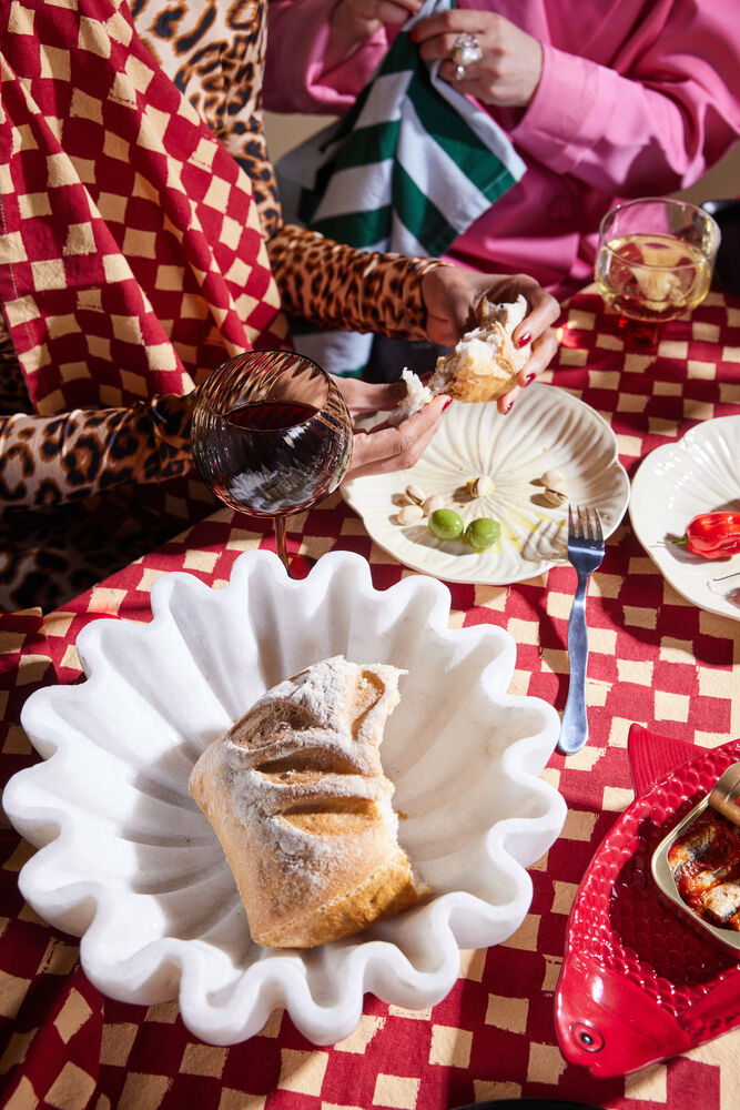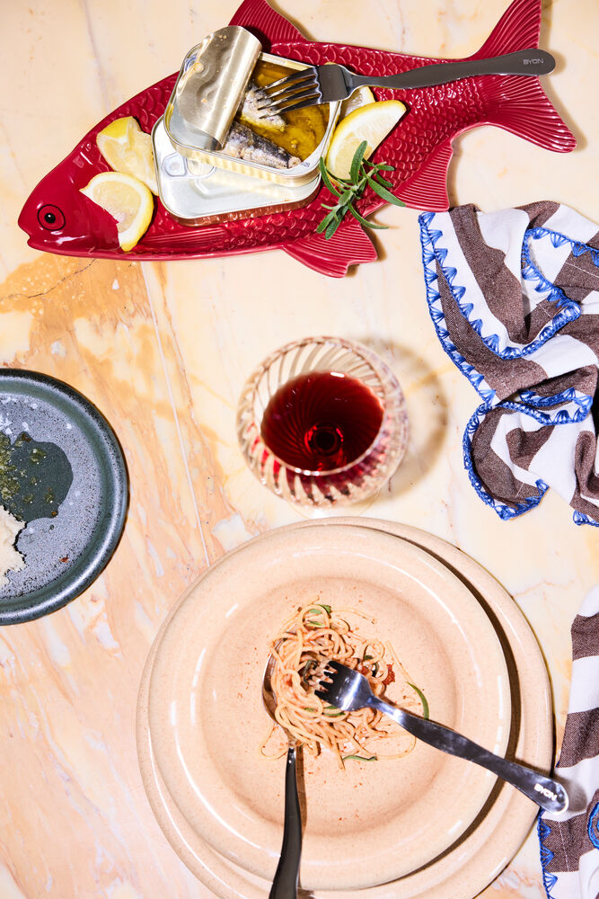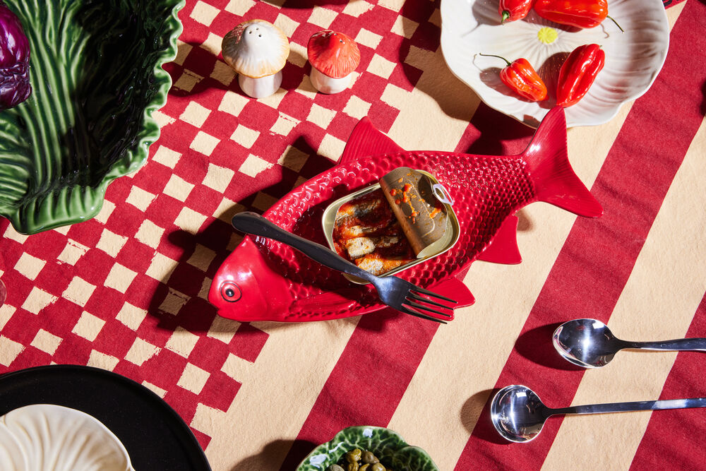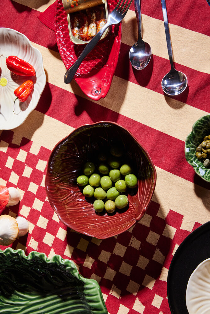 Tanken bak etableringen av Kai var å designe et morsom fat som skulle fungere som et samlingspunkt på det dekkede bordet i sesongens høytiden. Designet av en fisk i en mørkerød tone og et utstående mønster ble valgt for å gi retten karakter. For å tilføre både høyde og lekenhet ble rødkål inkludert som praktiske føtter. Dette gjør fatet både mer elegant og praktisk når den skal sendes over bordet. Materialet er dolomitt. Design Byon Studio. Leveres i Byon boks.