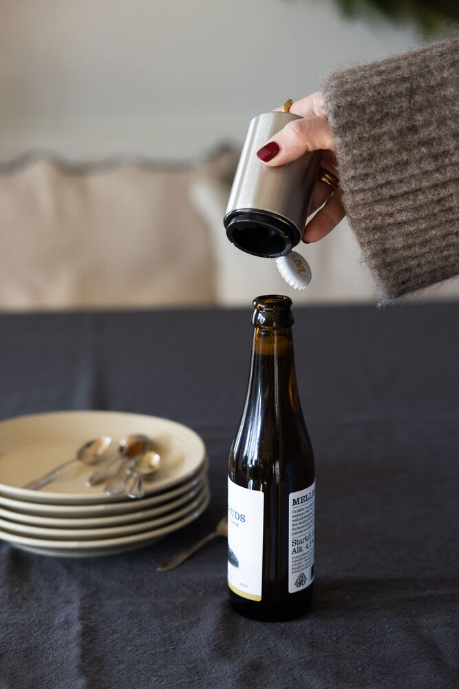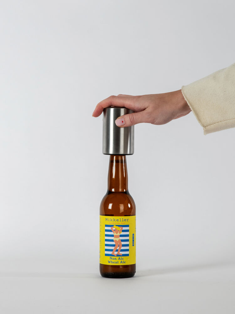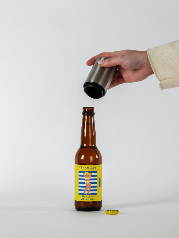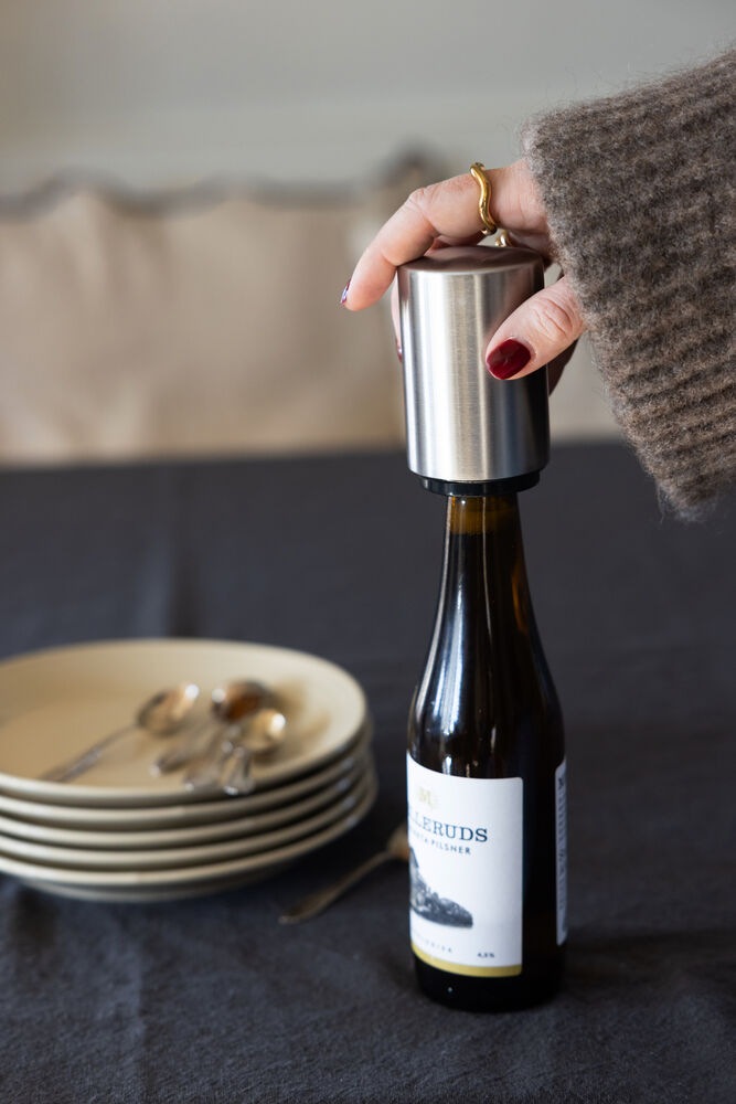 Smart flaskeåpner. Tre den over toppen av flasken og klem til.