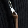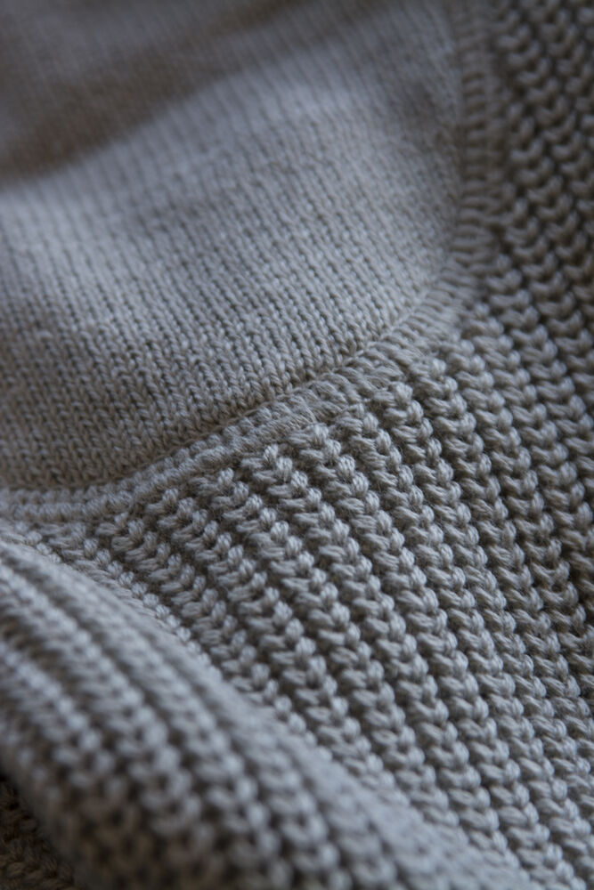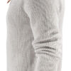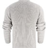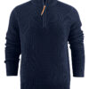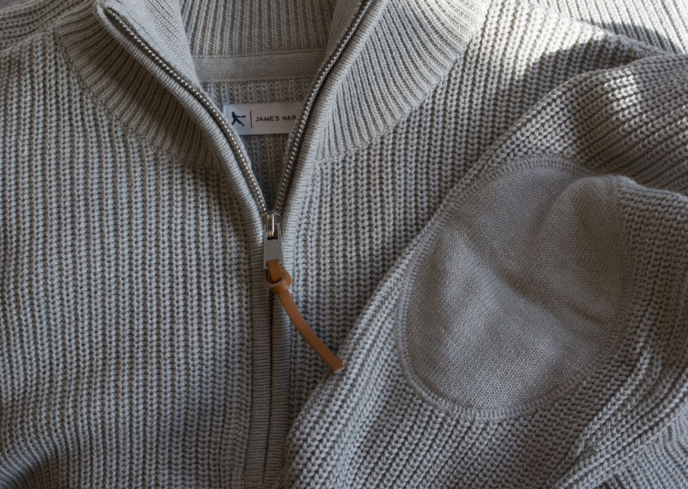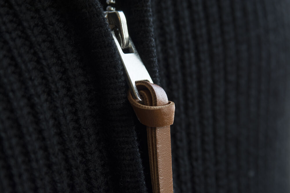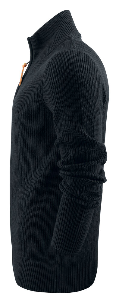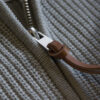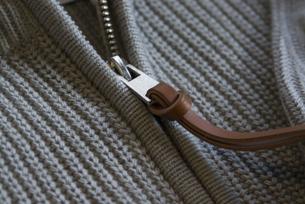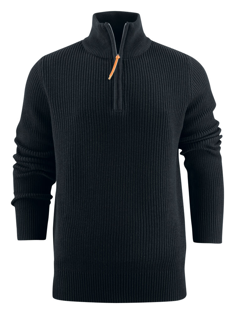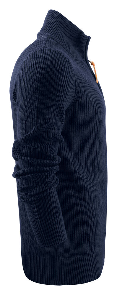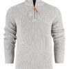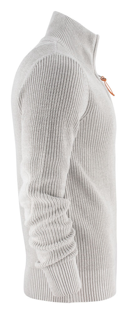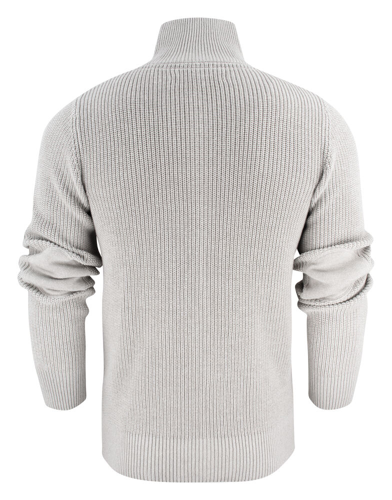 Grovstrikket 1/2 – zip genser. Metallglidelås med zip-puller av imitert lær. Patch på erm og ribbestrikket avslutning i nedekant, erm og krage (dobbelt lag).