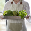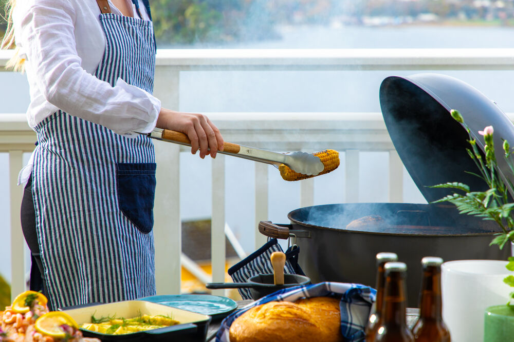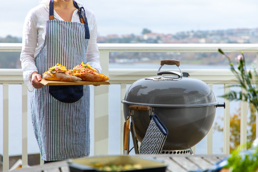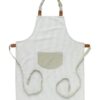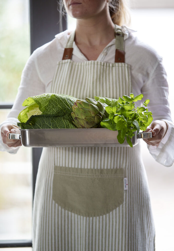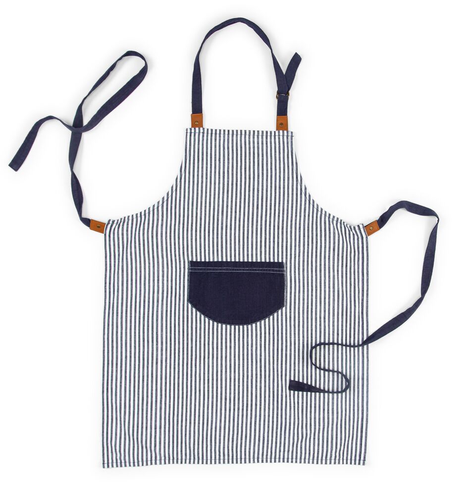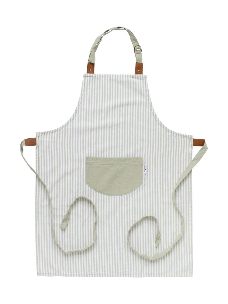 Unn deg selv eller en annen matlagingsentusiast et fint forkle. Dette forkleet har et enkelt og nautisk utseende med blå striper på hvit bakgrunn, laget av bomull og lin. Forkleet er utstyrt med en praktisk marineblå lomme foran og har et justerbart knytebånd i midjen og i halsen med kunstlærdetaljer. Perfekt for både han og henne! Match gjerne med grytekluter og grytevotter i samme serie.