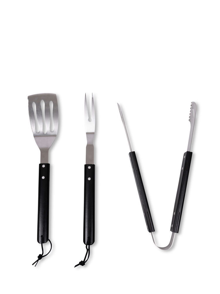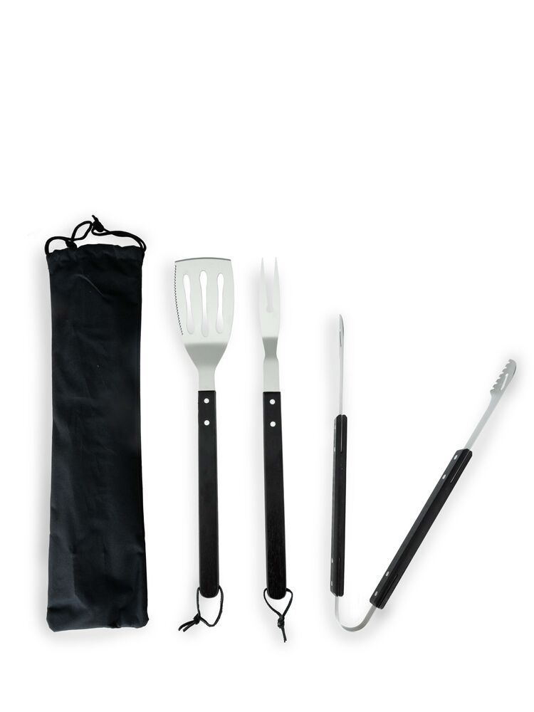 Solid grillsett i tre deler. Inneholder klype, spade og gaffel. Svartbeisede håndtak. Grillsettet selges i en stilig tøypose med snøring. Perfekt gave til grillmesteren!